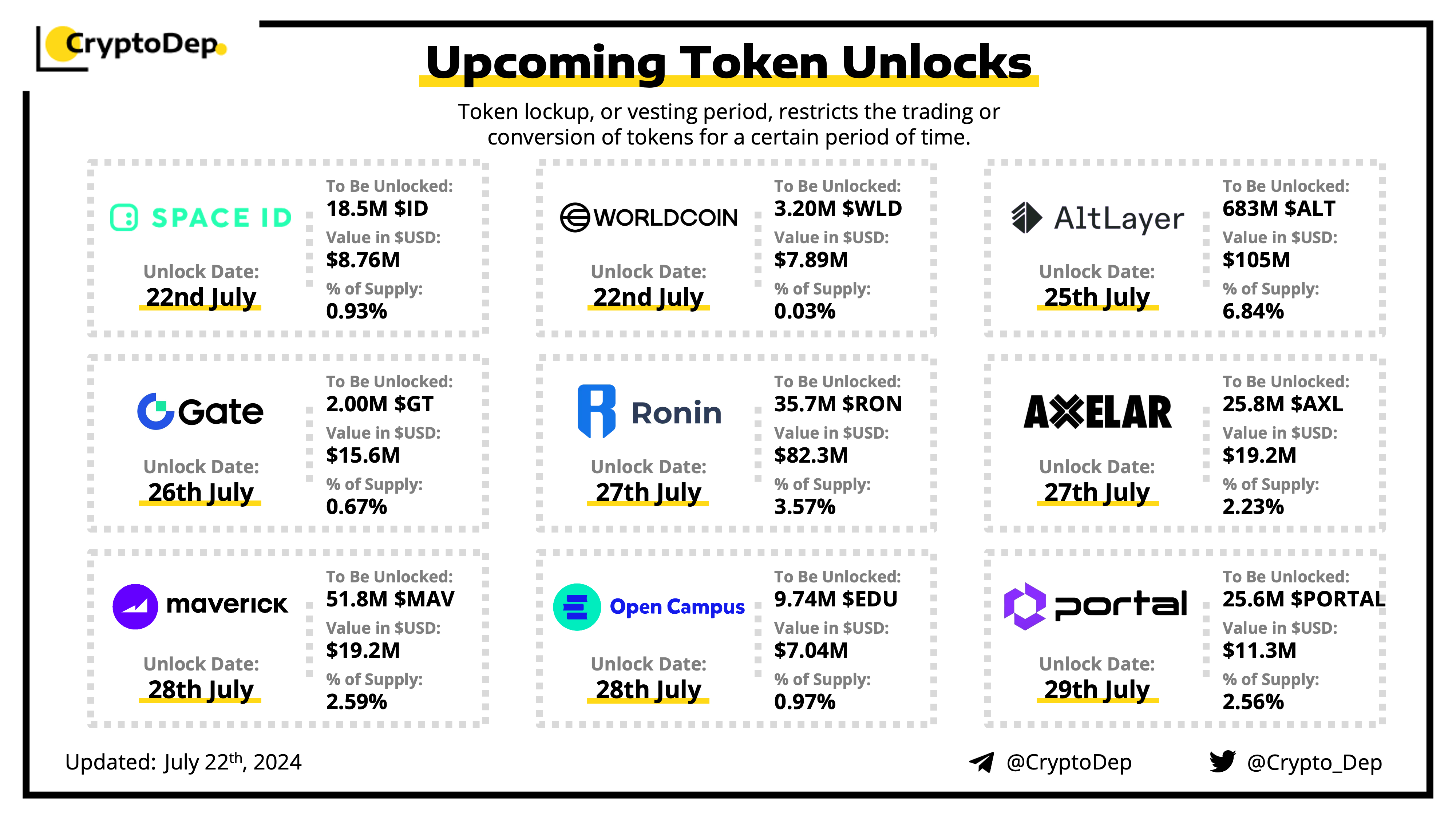 Let's take a look at the compilation of major upcoming token unlocks, diving into details such as dates, amounts, and projects related to tokens that are currently locked up, but will soon be released to the market. During this week, $ALT, $RON, $AXL, $GT, and $MAV will have the biggest unlocks.