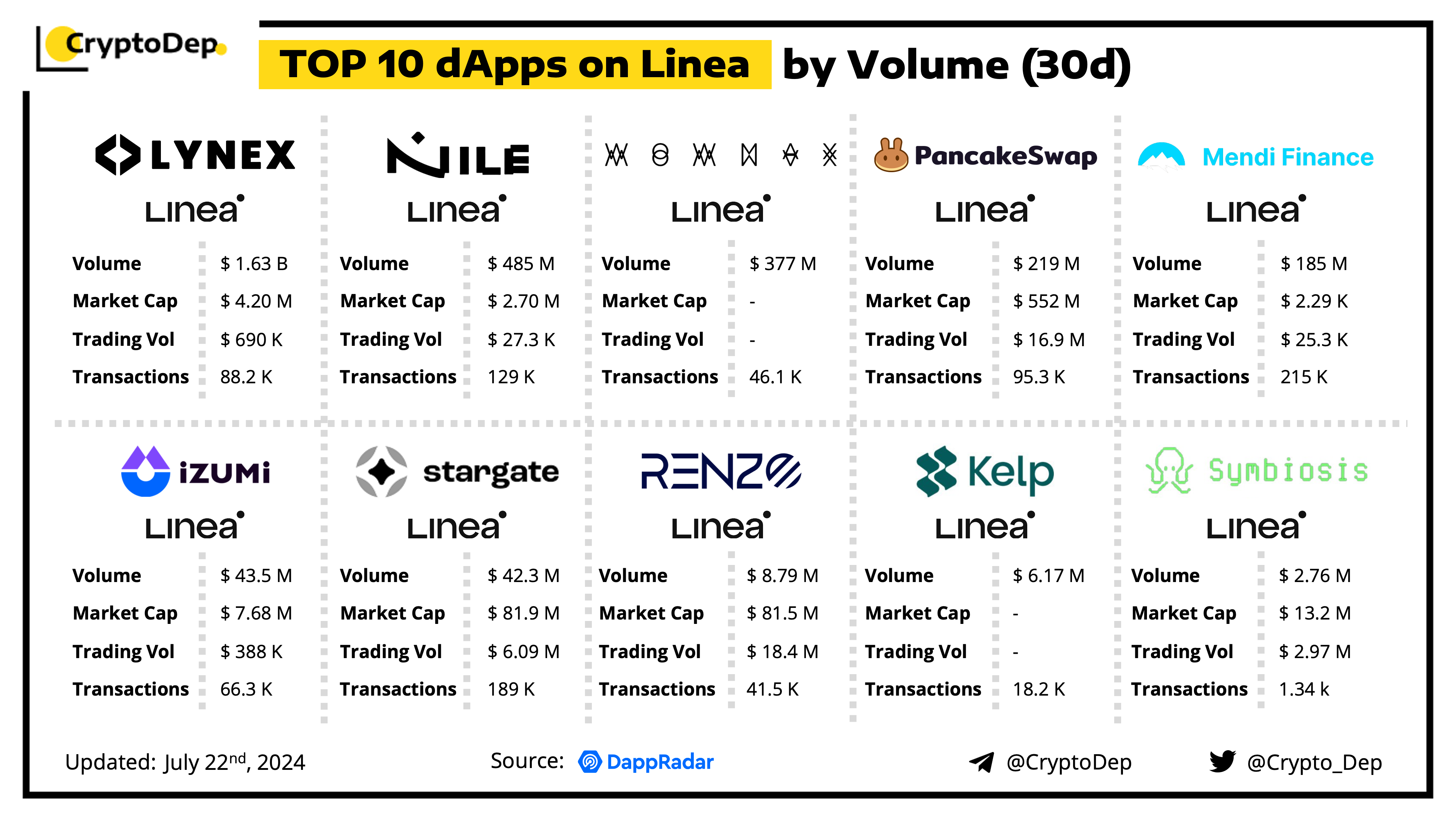 A decentralized application (dApp) is a program built on blockchain that combines a smart contract and a front-end user interface. We present the top dApps on #Linea by volume in the last 30 days, according to the data from DappRadar.