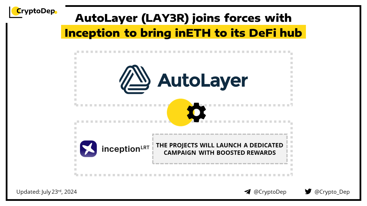 AutoLayer has announced an integration with the Inception liquid restaking protocol. Under this partnership, AutoLayer will bring $inETH to its DeFi hub, allowing users to restake $inETH using Arbitrum or Ethereum chains. Furthermore, the projects will launch a joint $inETH restaking campaign that will grant users boosted rewards and will last from July 22nd to TGE.