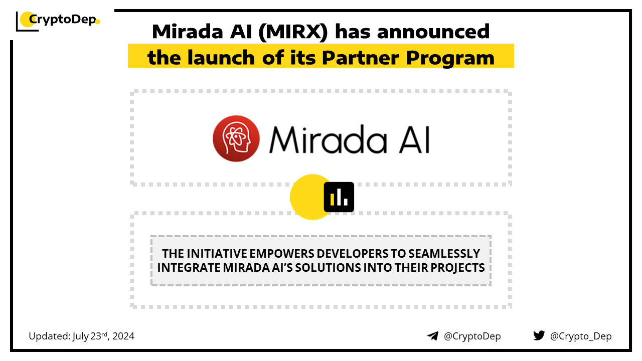 Mirada AI rolls out its Partner Program to help developers to integrate Mirada's AI solutions in their projects. In terms of this initiative, devs will get an access to advanced AI assistant, R&D support, AI-powered search engine, and autonomous community management among other features. Mirada AI is a decentralized AI tool, powered by AI via $MIRX, that offers image generation, face-swap, animation, LLM chat, image upscaling, and more.