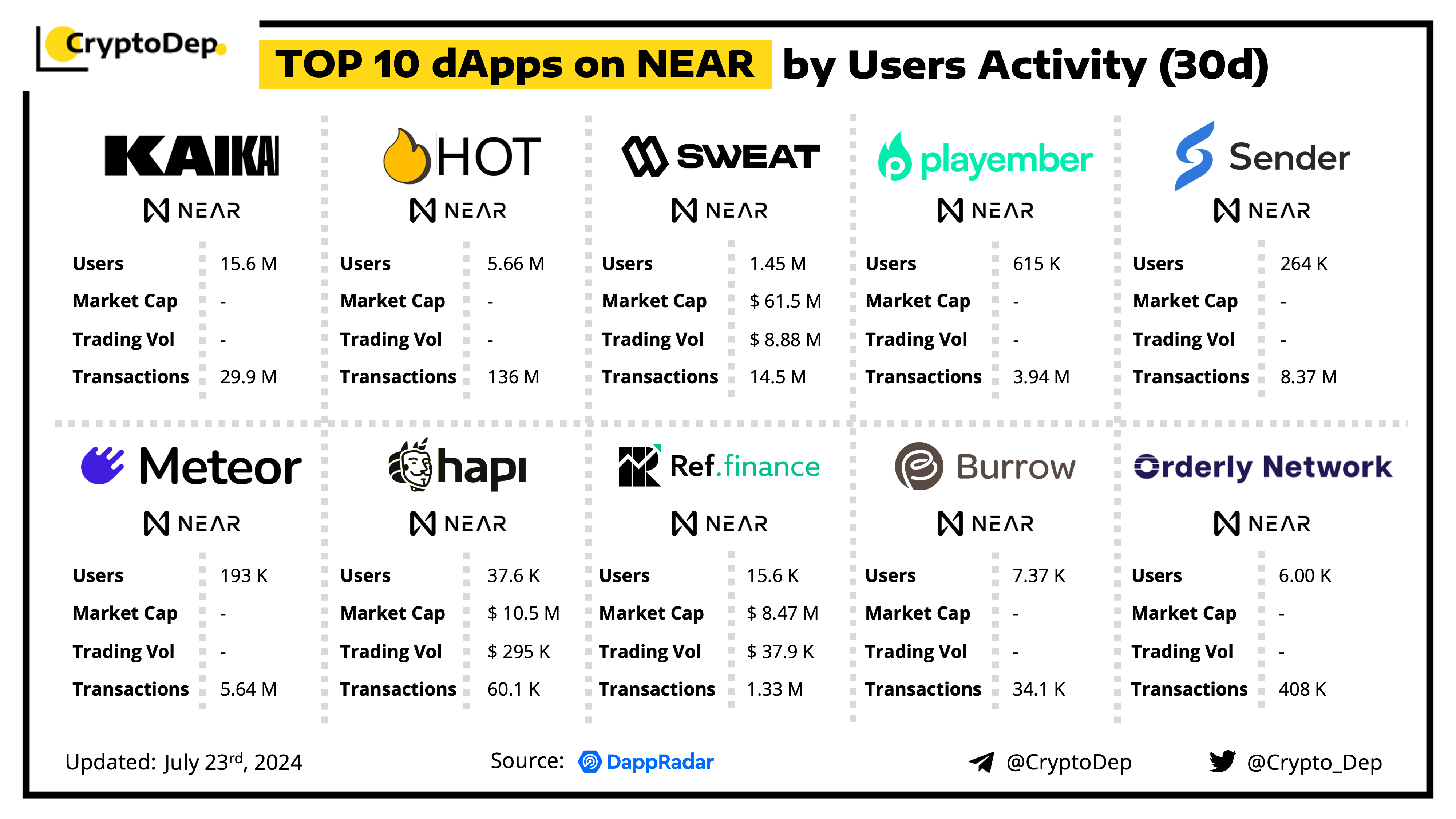 A decentralized application (dApp) is a program built on blockchain that combines a smart contract and a front-end user interface. We present the top dApps on #NEAR by users activity in the last 30 days, according to the data from DappRadar.
