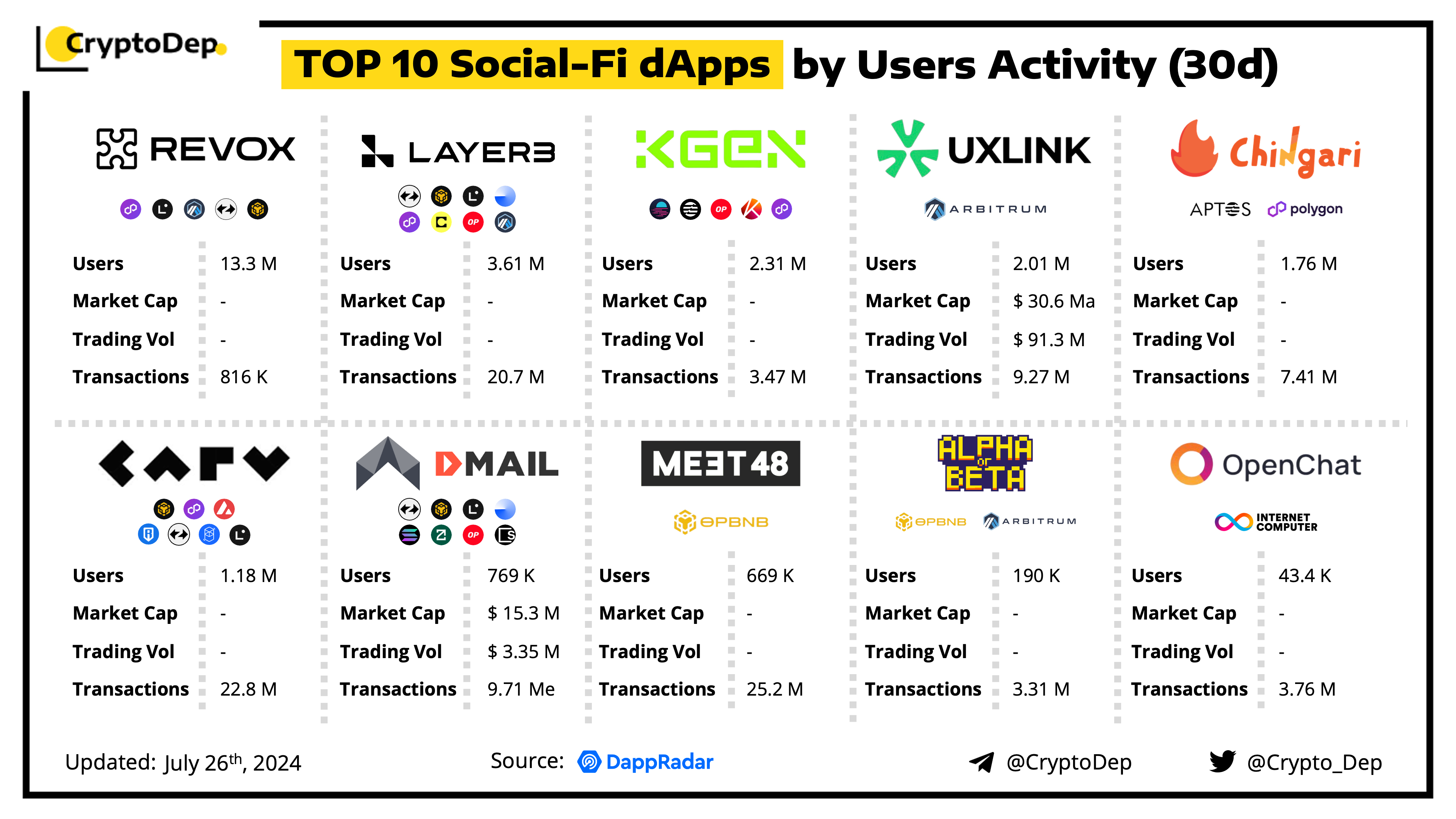 Let's take a look at the top 10 social-fi dApps, based on users' activity over the past 30 days, according to the DappRadar. Social-Fi brings together the principles of social media and DeFi by offering a Web3 approach to creating, managing, and owning social media platforms and the content generated by its participants.