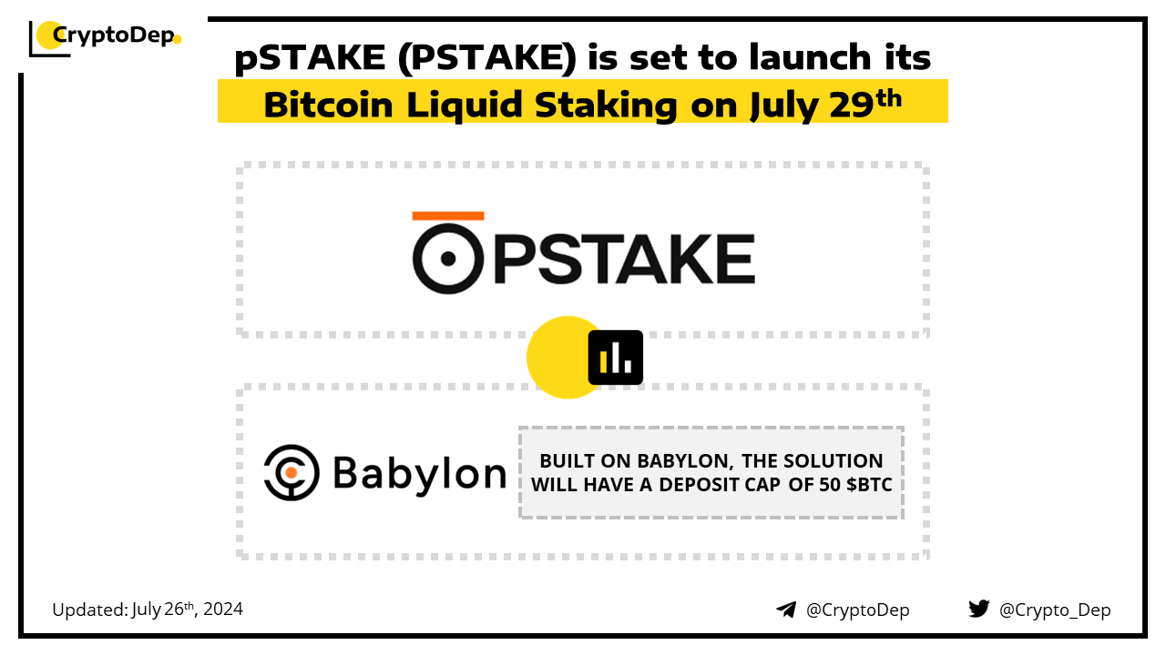 pSTAKE will roll out its Bitcoin liquid staking on July 29th with a 50 $BTC deposit cap. Built on Babylon, pSTAKE's Bitcoin liquid staking will also have a points program at the mainnet launch. Earlier in June, pSTAKE launched the solution on test network. pSTAKE Finance is a multichain liquid staking protocol backed by Binance Labs.