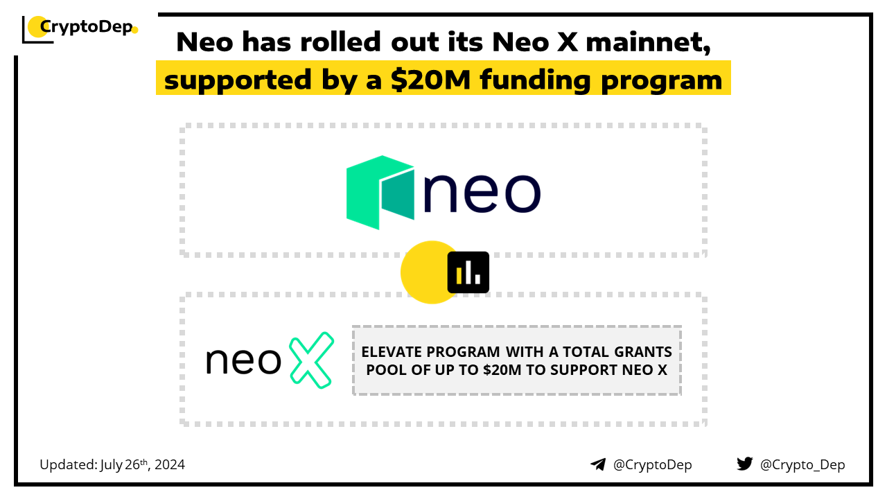 Neo announces the launch of Neo X mainnet, its EVM-based MEV-resistant sidechain, along with the native bridge and a $20M Elevate funding program. Users can now interact with an interoperability layer through a native cross-chain bridge between EVM Neo X and NeoVM Neo N3. To support the new Neo X's ecosystem, the project has kicked off the Elevate funding program with a total grants pool of up to $20M.