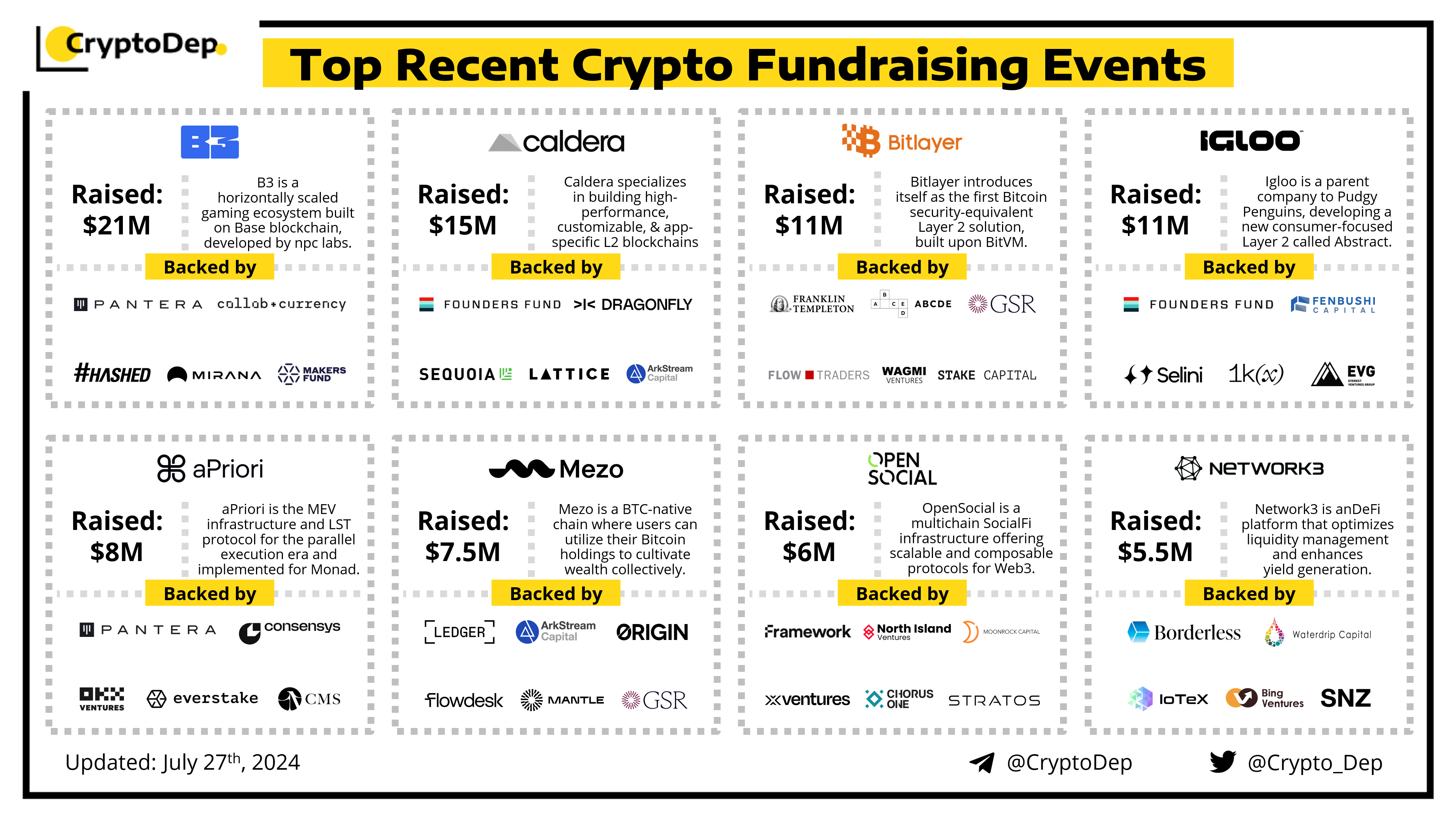 Presenting a list of some recent crypto fundraising events, backed by well-known investors such as Sequoia Capital, Pantera Capital, Founders Fund, Dragonfly, Hashed, Framework, Moonrock Capital, OKX Ventures, Consensys, Borderless, CMS, Franklin Templeton, Waterdrip, IoTex, Ledger, Mantle, and others. Let's take a look!