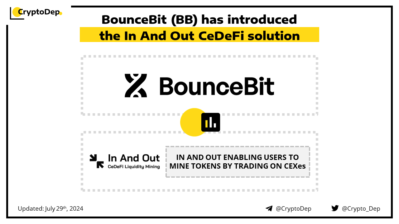 BounceBit announces the launch of In And Out, a CeDeFi liquidity incentive product. This innovation introduces the concept of CeDeFi Liquidity Mining, enabling users to mine tokens by trading on centralized exchanges. This move follows BounceBit's previous innovation of Liquid Custody which aims to make CeFi assets liquid and lower the barrier to entry. BounceBit is building a BTC restaking infrastructure that provides a foundational layer for different restaking products.
