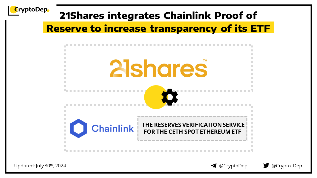 21Shares has announced the integration of the industry-standard Chainlink Proof of Reserve on Ethereum. Through this innovation, 21Shares aims to increase the transparency of underlying ETH reserves of its ETF (CETH). Back in February 2024, 21Shares integrated Chainlink Proof of Reserve to enhance the transparency of the Bitcoin reserves backing the ARK 21Shares Bitcoin ETF.