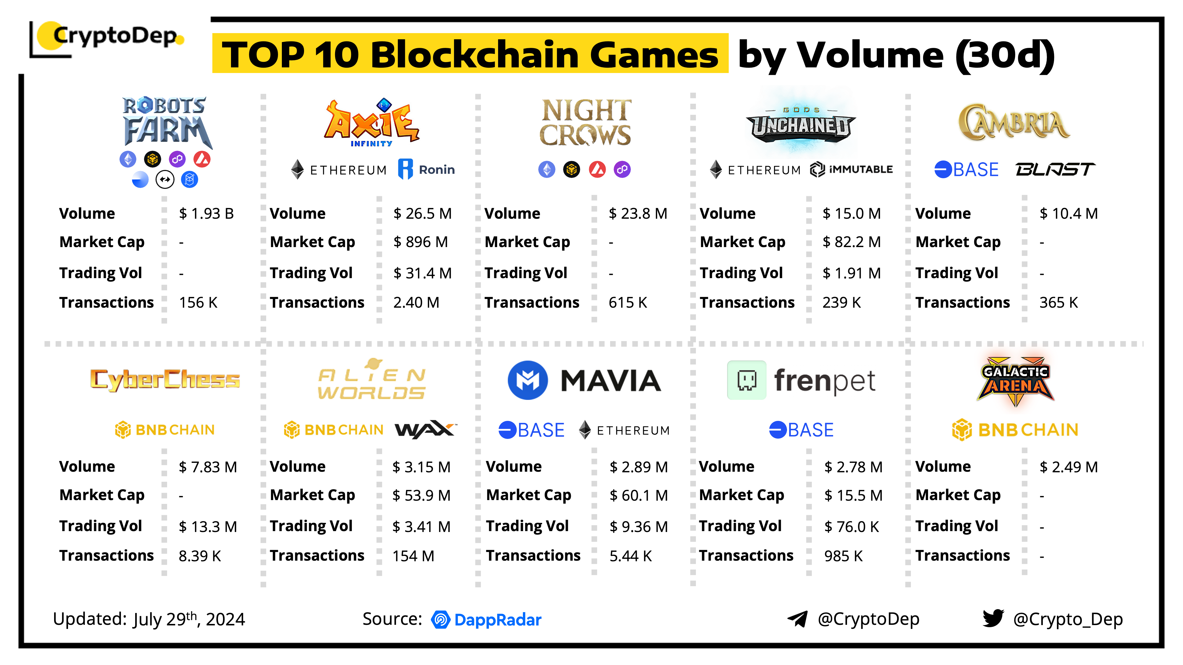 With the spread of Web3 technologies, blockchain games became the industry trend and keep on attracting the attention of gaming & crypto communities. We have made a recap of top blockchain games by volume in the last 30 days, so let's take a look!