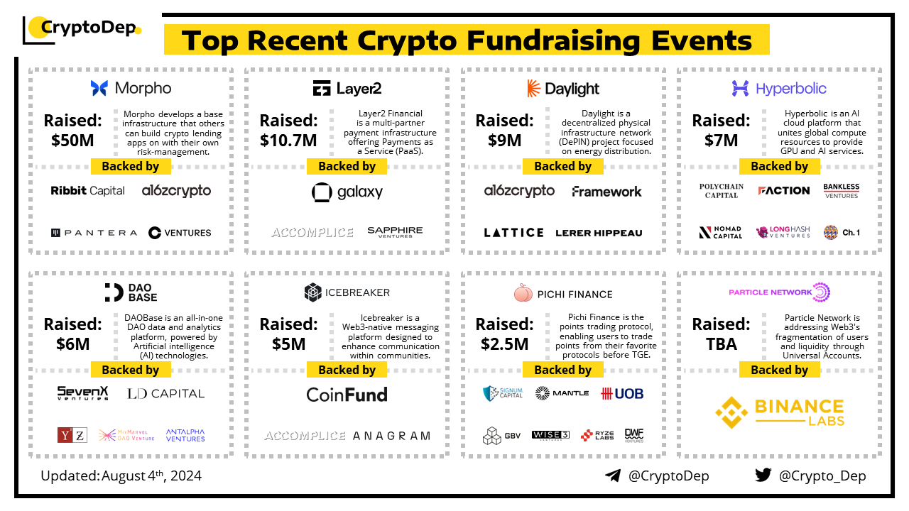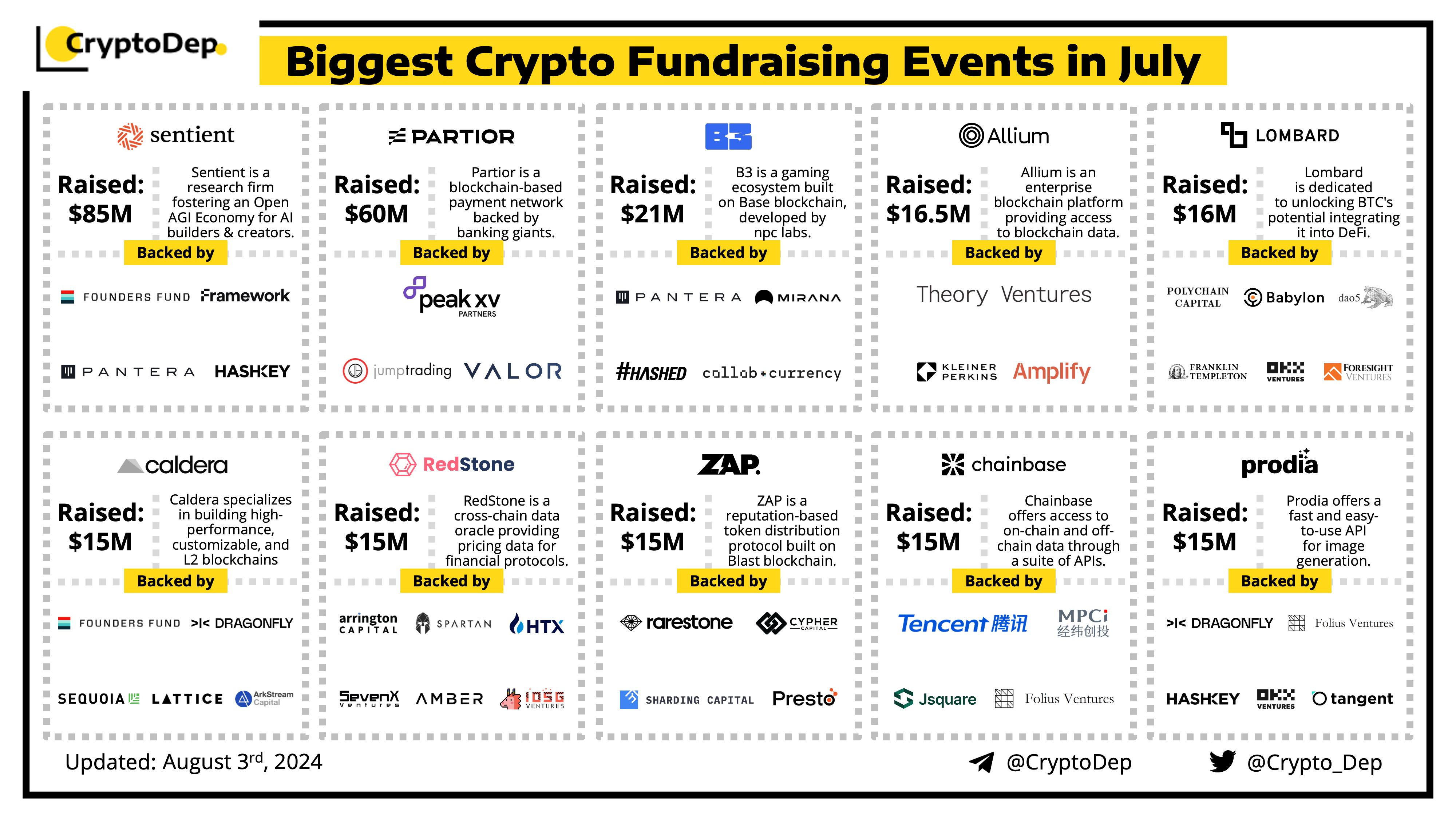 Presenting a list of the biggest crypto fundraising rounds in July 2024, backed by well-known investors such as Sequoia Capital, Pantera Capital, Dragonfly, Founders Fund, Hashed, Framework, Hashkey, Polychain, IOSG, Arrington Capital, Spartan, OKX Ventures, HTX Ventures, and others. Let's take a look!