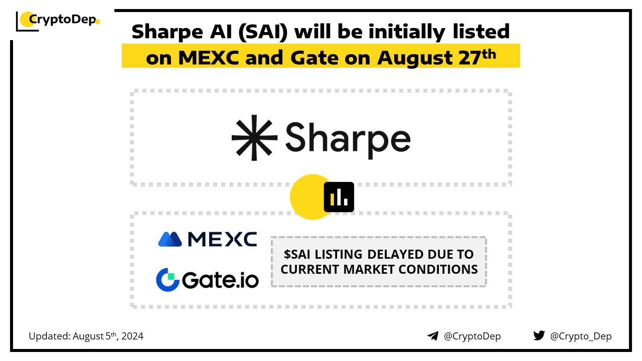 Sharpe AI has decided to delay its listing on the MEXC and Gate exchanges. The event was rescheduled due to the current market conditions and will take place on August 27th, at 13:00 UTC. Sharpe AI has previously reached a multi-year data licensing agreement with CME Group. Sharpe is an institutional-grade crypto superApp, serving as a unified frontend for intelligence, tracking, and investing in digital assets.