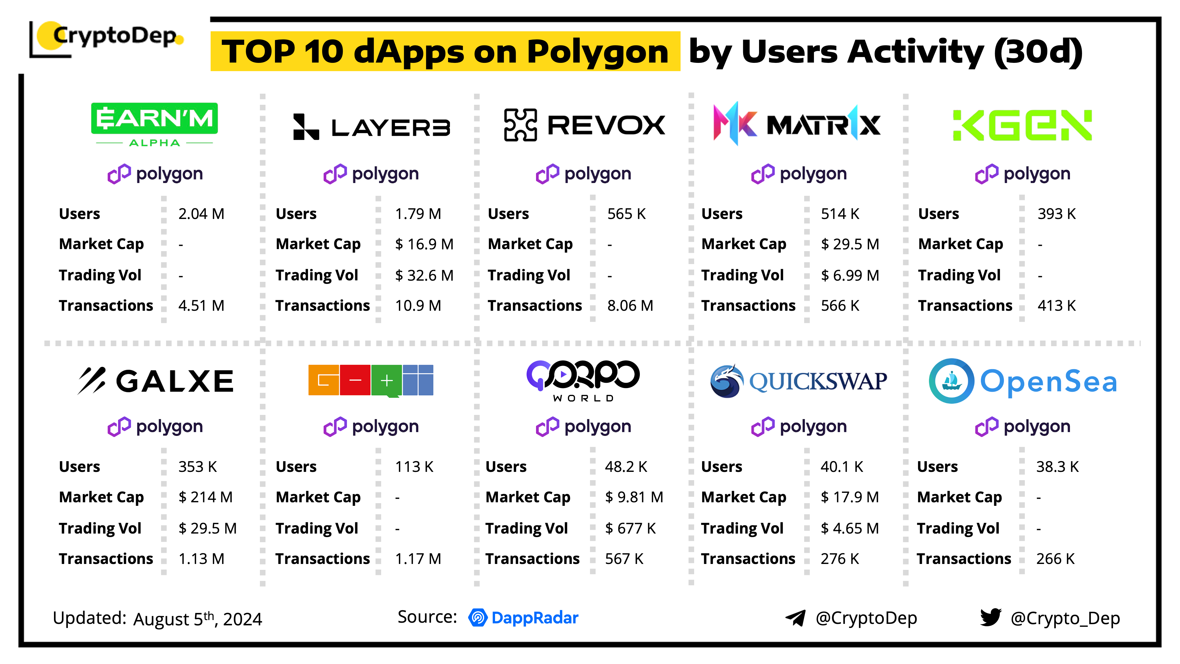 A decentralized application (dApp) is a program built on blockchain that combines a smart contract and a front-end user interface. We present the top dApps on #Polygon by volume in the last 30 days, according to the data from DappRadar.