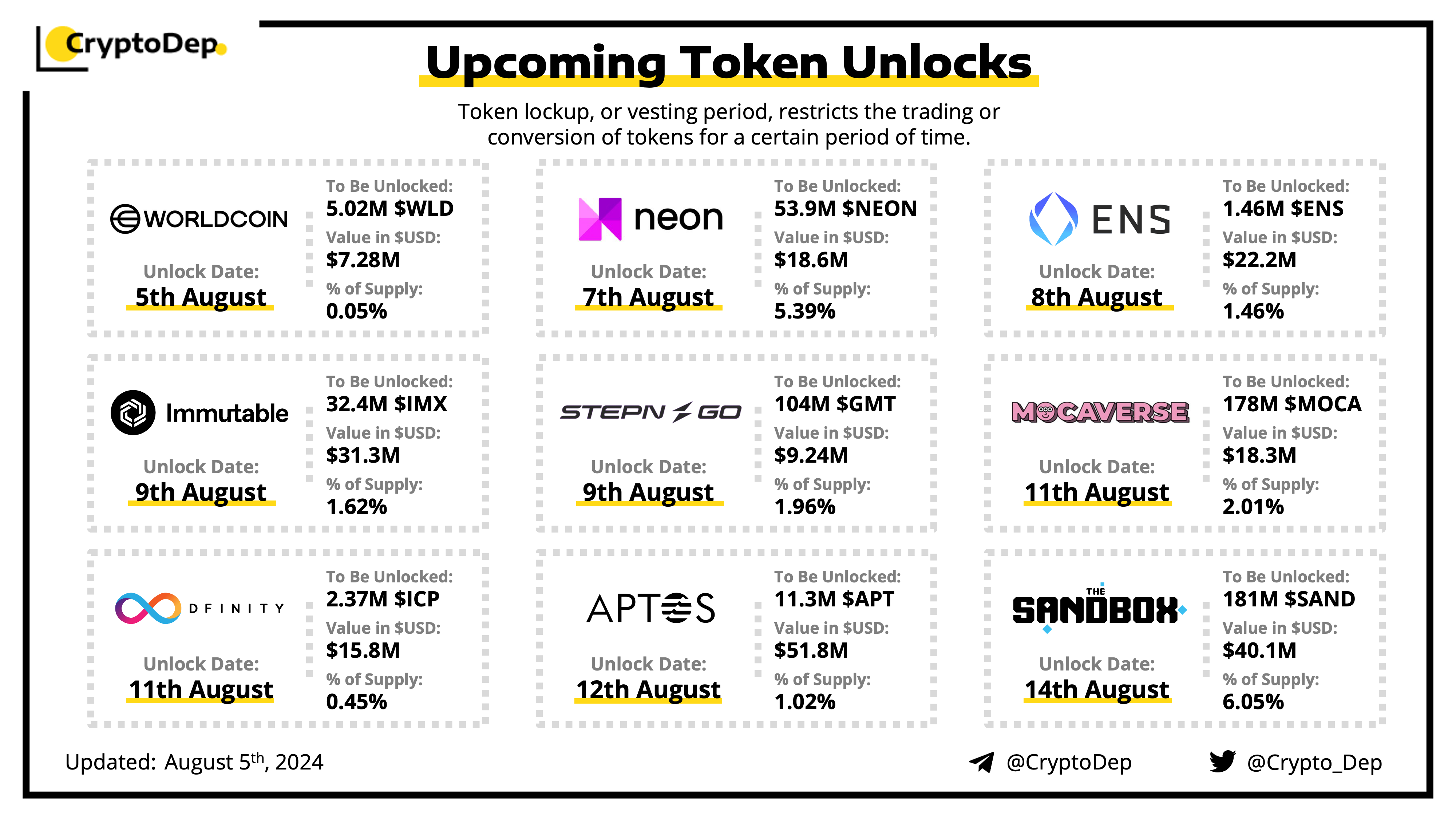 Let's take a look at the compilation of major upcoming token unlocks, diving into details such as dates, amounts, and projects related to tokens that are currently locked up, but will soon be released to the market. During this week, $APT, $SAND, $IMX, $ENS, and $NEON will have the biggest unlocks.