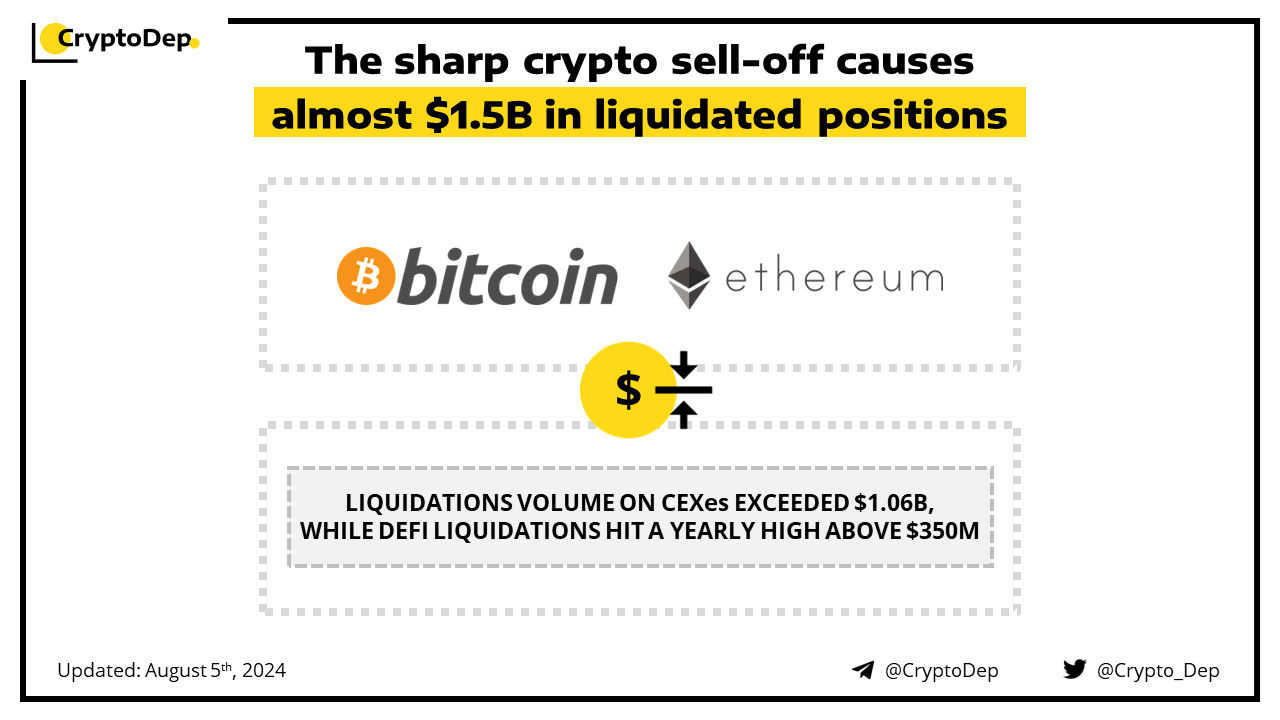 The crypto market has witnessed its largest three-day sell-off in the past year amid weak jobs data in the US and revived fears of a recession. Liquidations volume on CEXes exceeded $1.06B, while defi liquidations hit a yearly high above $350M. Bitcoin $BTC plunged below $50,000, to its lowest level since February, while ether $ETH traded down below $2,200, as investors reacted to macroeconomic updates, Jump Cryptoβs asset movements, and US elections update.