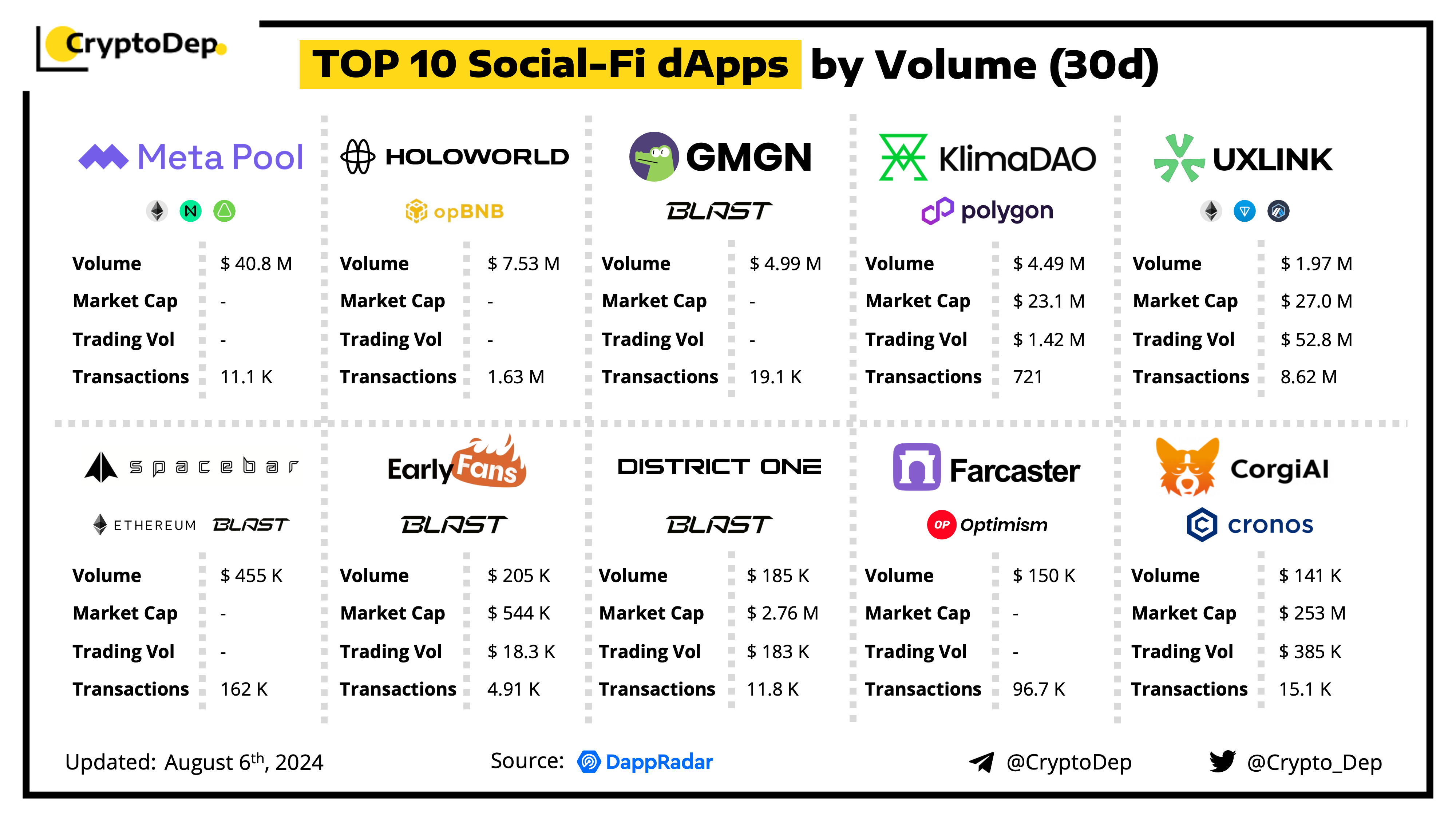 Let's take a look at the top 10 social-fi dApps, based on the total amount of incoming value to dapp's smart contracts over the past 30 days. Social-Fi brings together the principles of social media and decentralized finance by offering a Web3 approach to creating, managing, and owning social media platforms and the content generated by its participants.