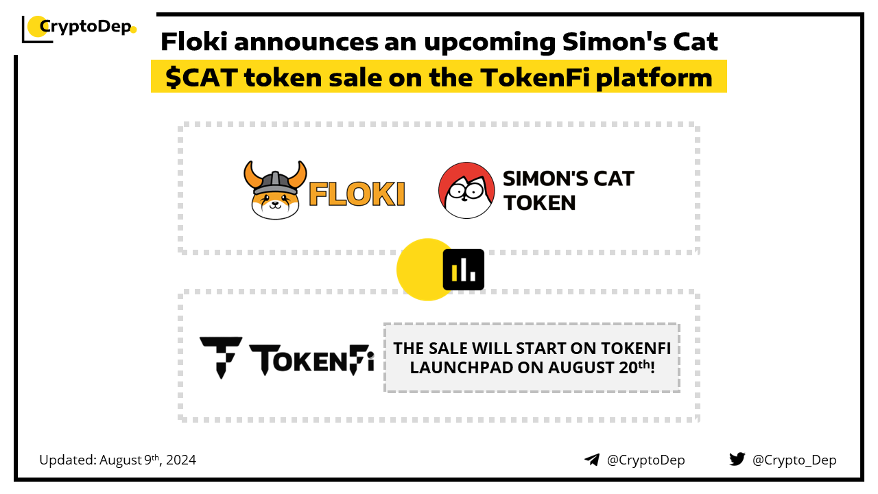 Floki unveils the launch of the Simon's Cat memecoin that will take place on TokenFi, on August 20th. Users will be able to participate in the sale by holding and staking $TOKEN. Participants will be divided into 6 tiers, depending on the staked $TOKEN amount. Moreover, 18.5% of the $CAT supply will be allocated to $FLOKI holders. Simonβs Cat token is the official BNB Chain-based memecoin of Simonβs Cat, one of the worldβs most popular cat meme and animated series.
