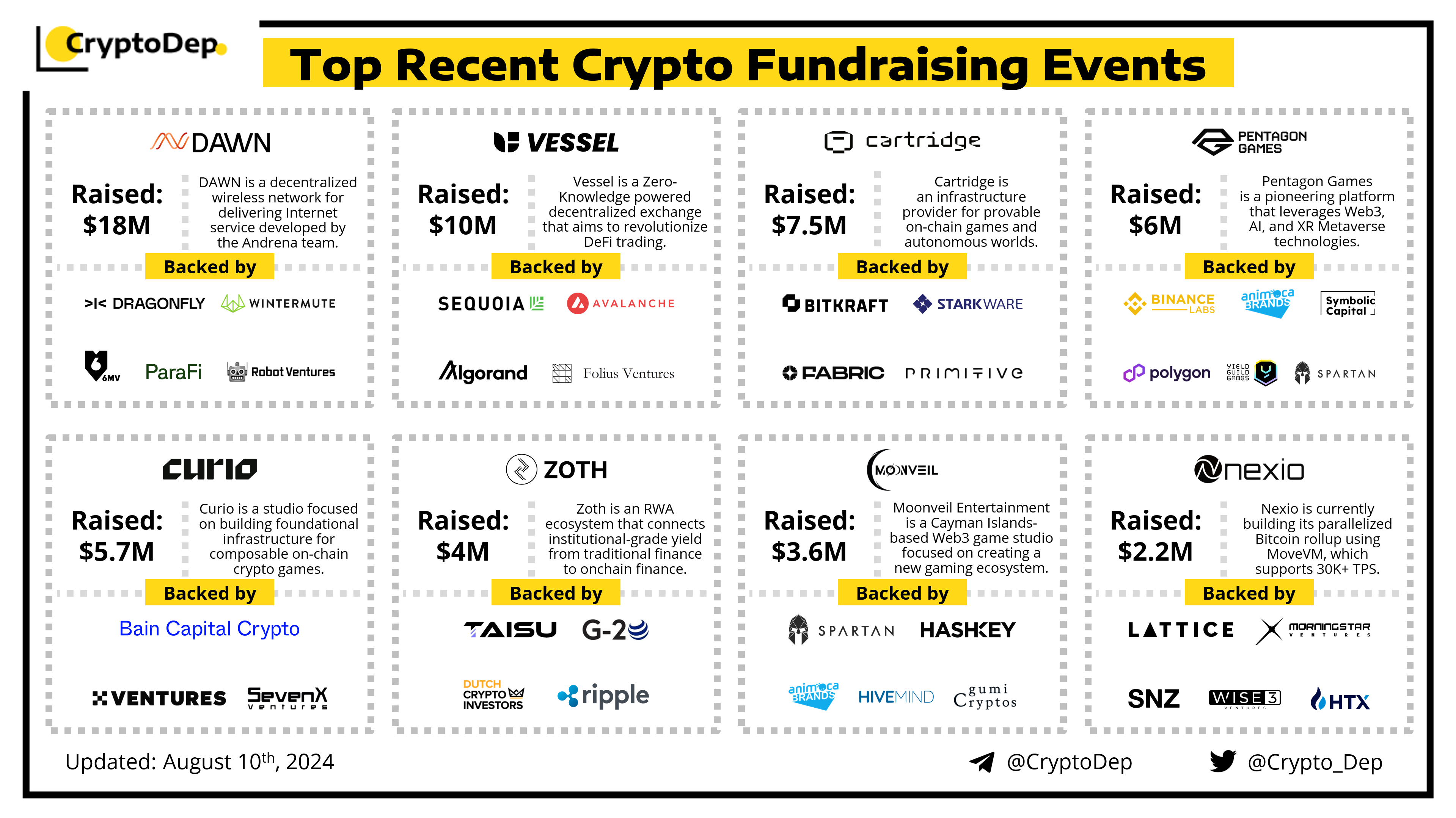 Presenting a list of some recent crypto fundraising events, backed by well-known investors such as Sequoia Capital, Binance Labs, Dragonfly, Animoca Brands, Hashkey, Bitkraft, Spartan, Morningstar Ventures, Wintermute, OKX Ventures, HTX Ventures, Polygon, Avalanche, Algorand, StarkWare, and others. Let's take a look!