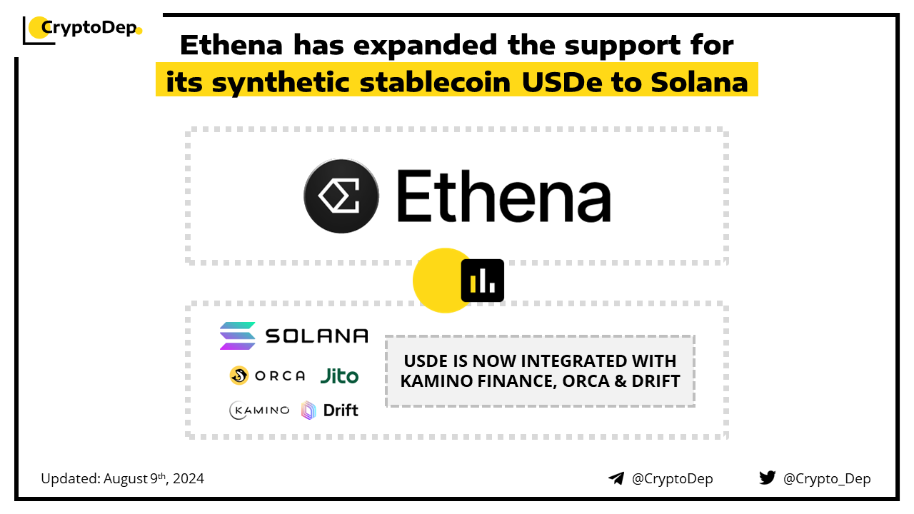 Ethena announces the launch of its USDe synthetic stablecoin on the Solana blockchain. Through this innovation, users can now access USDe via Kamino Finance, Orca, and Drift Protocol, while the support on Jito will be enabled soon. Ethena is a derivative infrastructure provider on Ethereum, with the USDe stablecoin, backed by Binance Labs, Dragonfly, Maelstrom, and others.