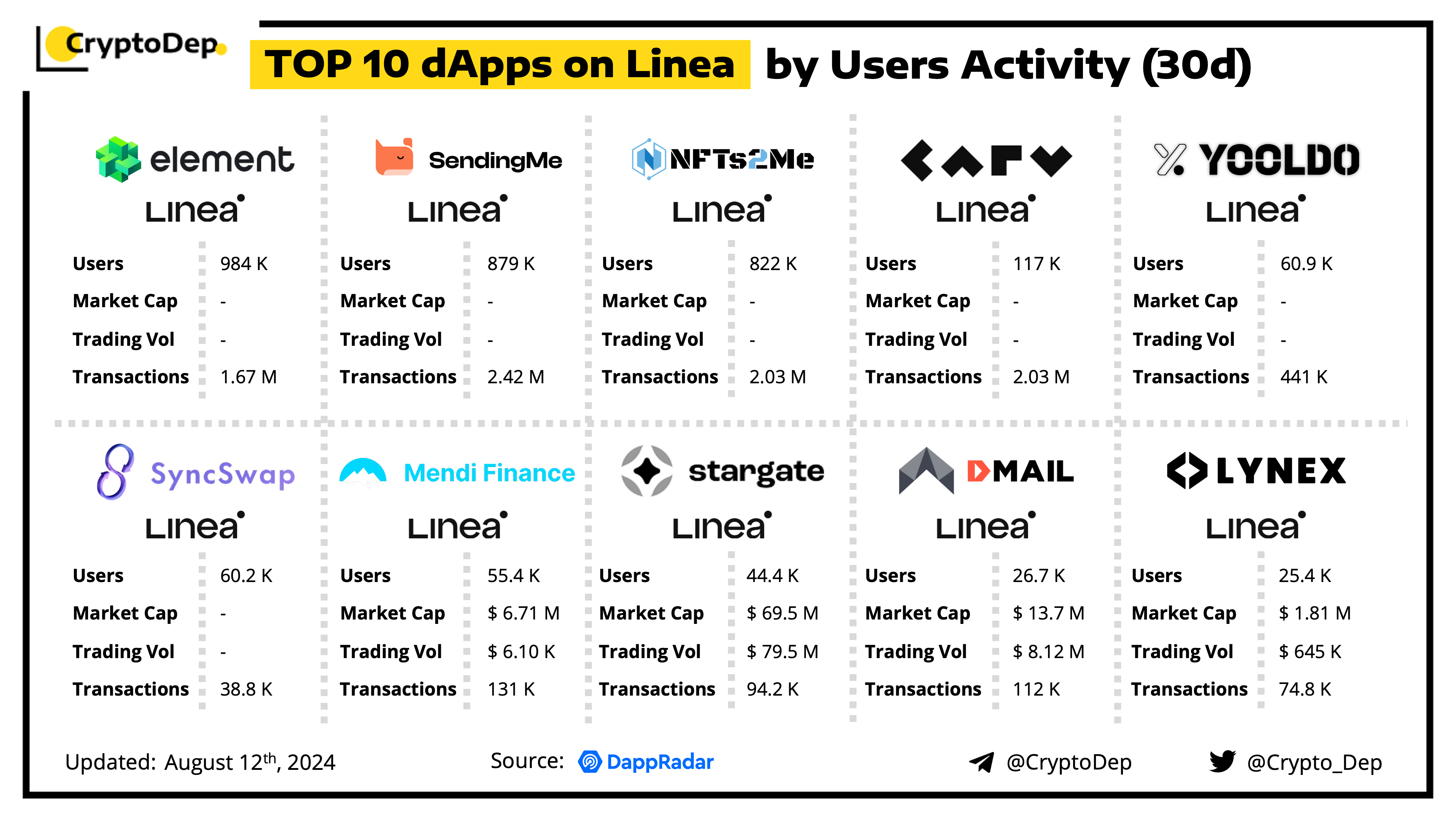 A decentralized application (dApp) is a program built on blockchain that combines a smart contract and a front-end user interface. We present the top dApps on #Linea by users activity in the last 30 days, according to the data from DappRadar.