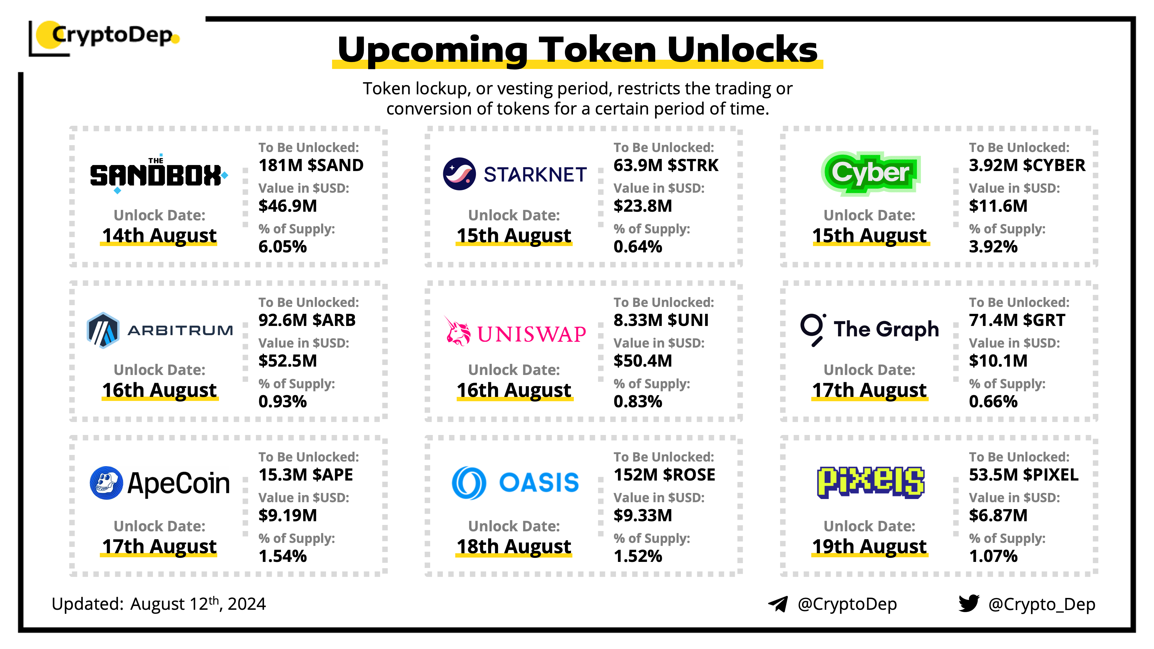 Let's take a look at the compilation of major upcoming token unlocks, diving into details such as dates, amounts, and projects related to tokens that are currently locked up, but will soon be released to the market. During this week, $ARB, $UNI, $SAND, $STRK, and $CYBER will have the biggest unlocks.