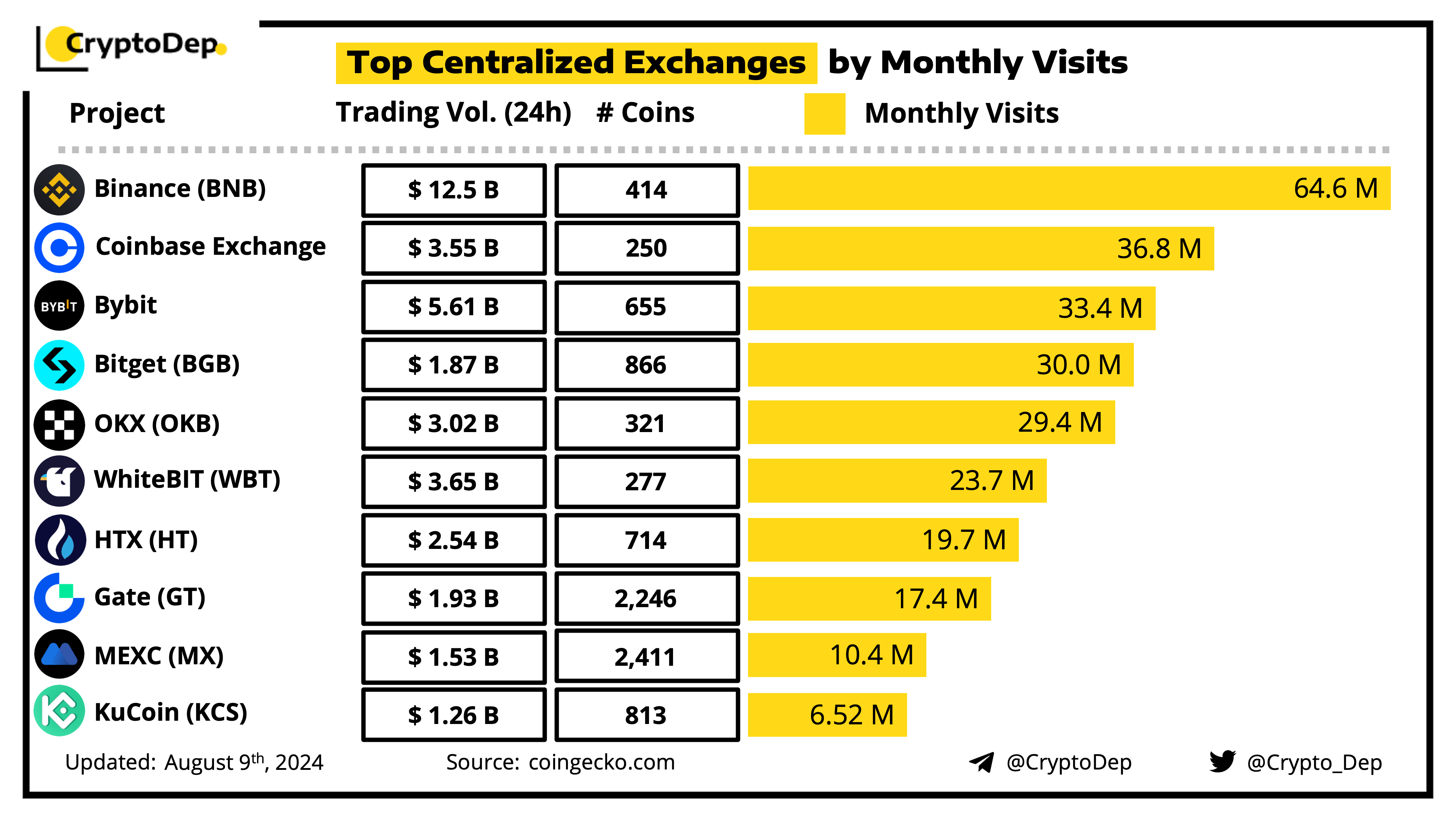 Let's take a look at the ranking of top centralized exchanges by monthly visits. Monthly visits to the website (not including mobile app) based on data from SimilarWeb and CoinGecko.