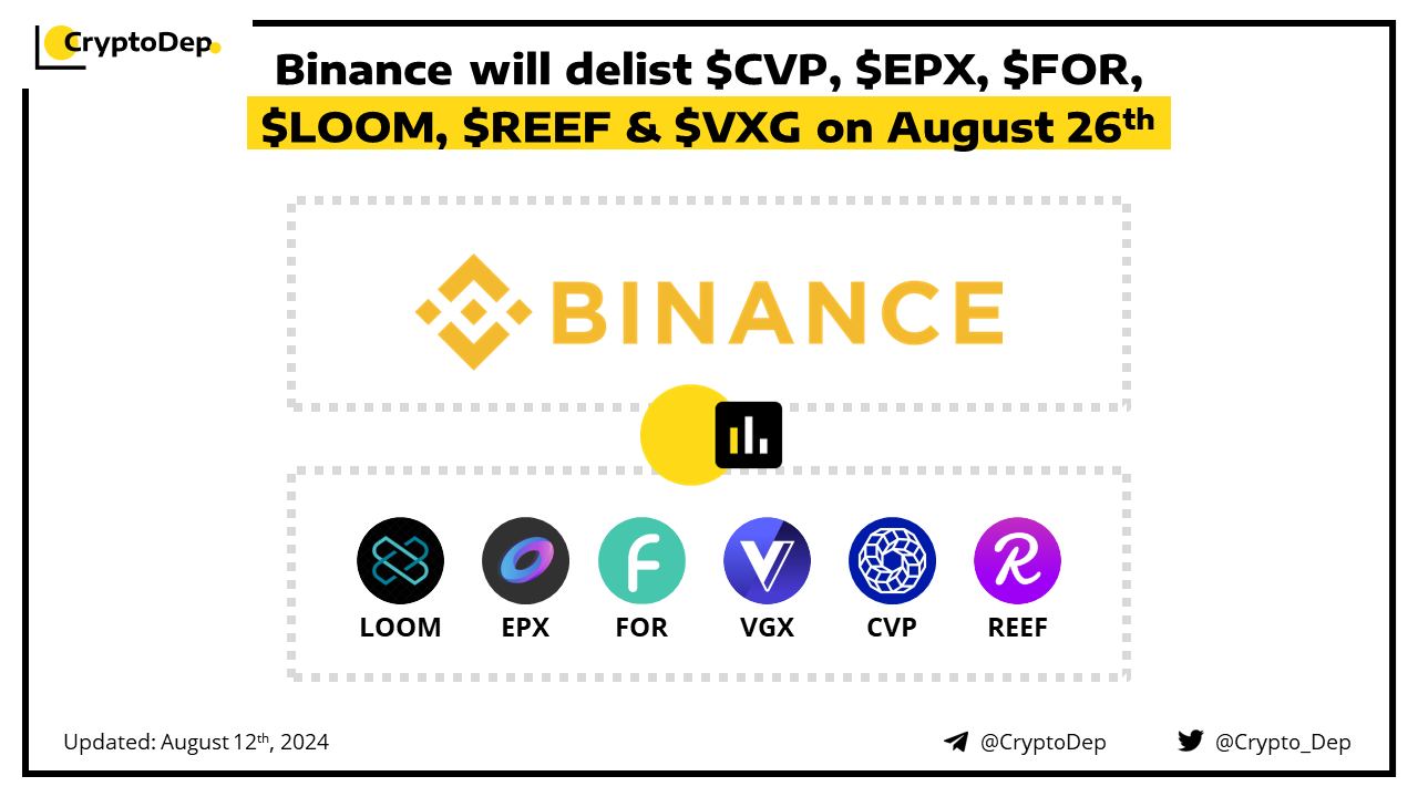ββBinance will delist $CVP, $EPX, $FOR, $LOOM, $REEF & $VXG on August 26th