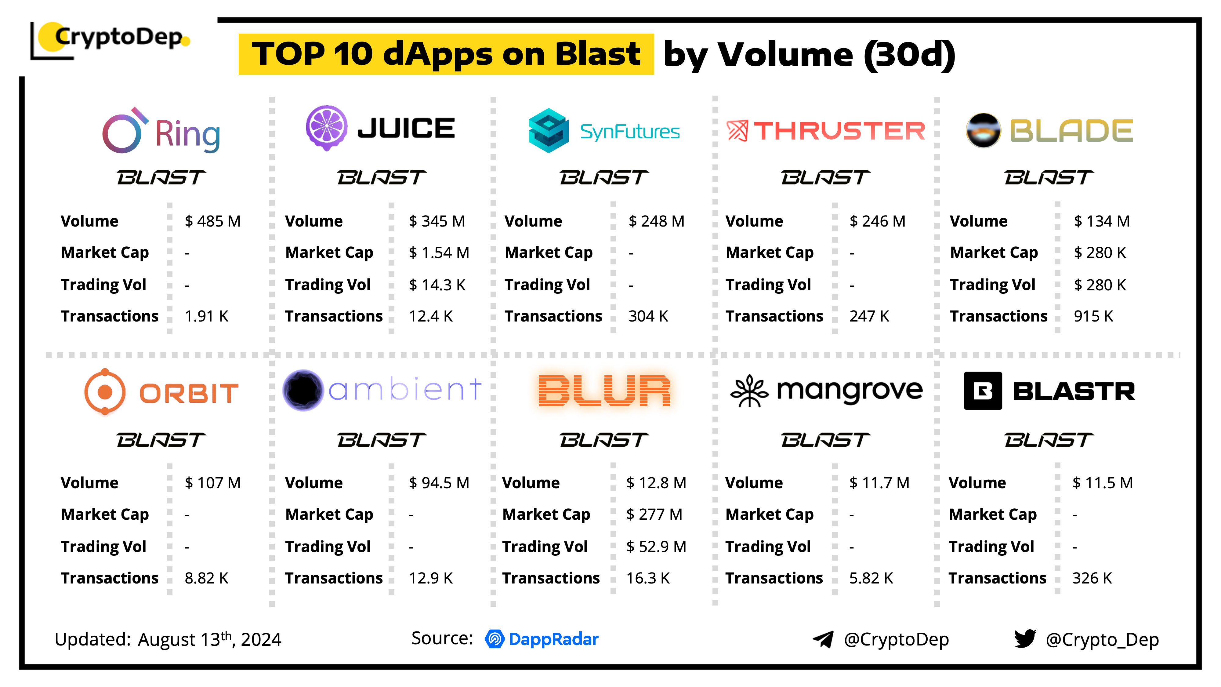 A decentralized application (dApp) is a program built on blockchain that combines a smart contract and a front-end user interface. We present the top dApps on #Blast by volume in the last 30 days, according to the data from DappRadar.