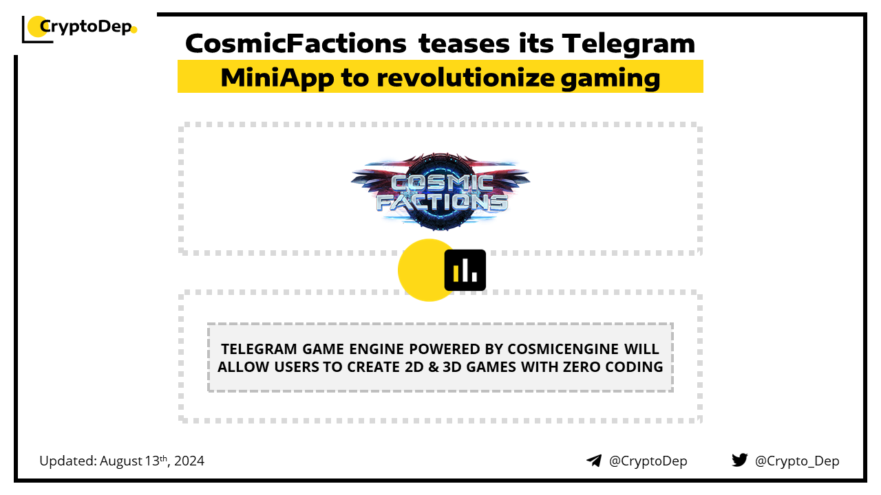 CosmicFactions introduces its Telegram MiniApp gaming engine powered by CosmicEngine. The application will allow users to create 2D & 3D games with zero coding with seamless in-chat gaming and pioneering EVM & TON integration enabled. CosmicFactions is the no-code, AI-powered game engine that lets users effortlessly design, build, and launch games across a decentralized cosmos.
