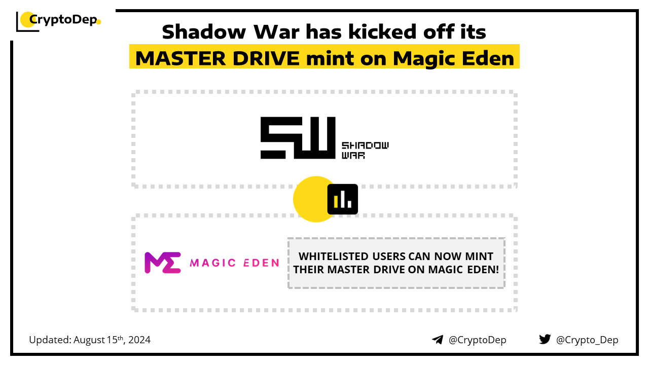 Shadow War launches its MASTER DRIVE mint on the Magic Eden platform. Whitelisted users now have ~12 hours to mint their MASTER DRIVE. Shadow War is a hybrid action title for fans of strategic pulse-pounding combat and stylish action gameplay.