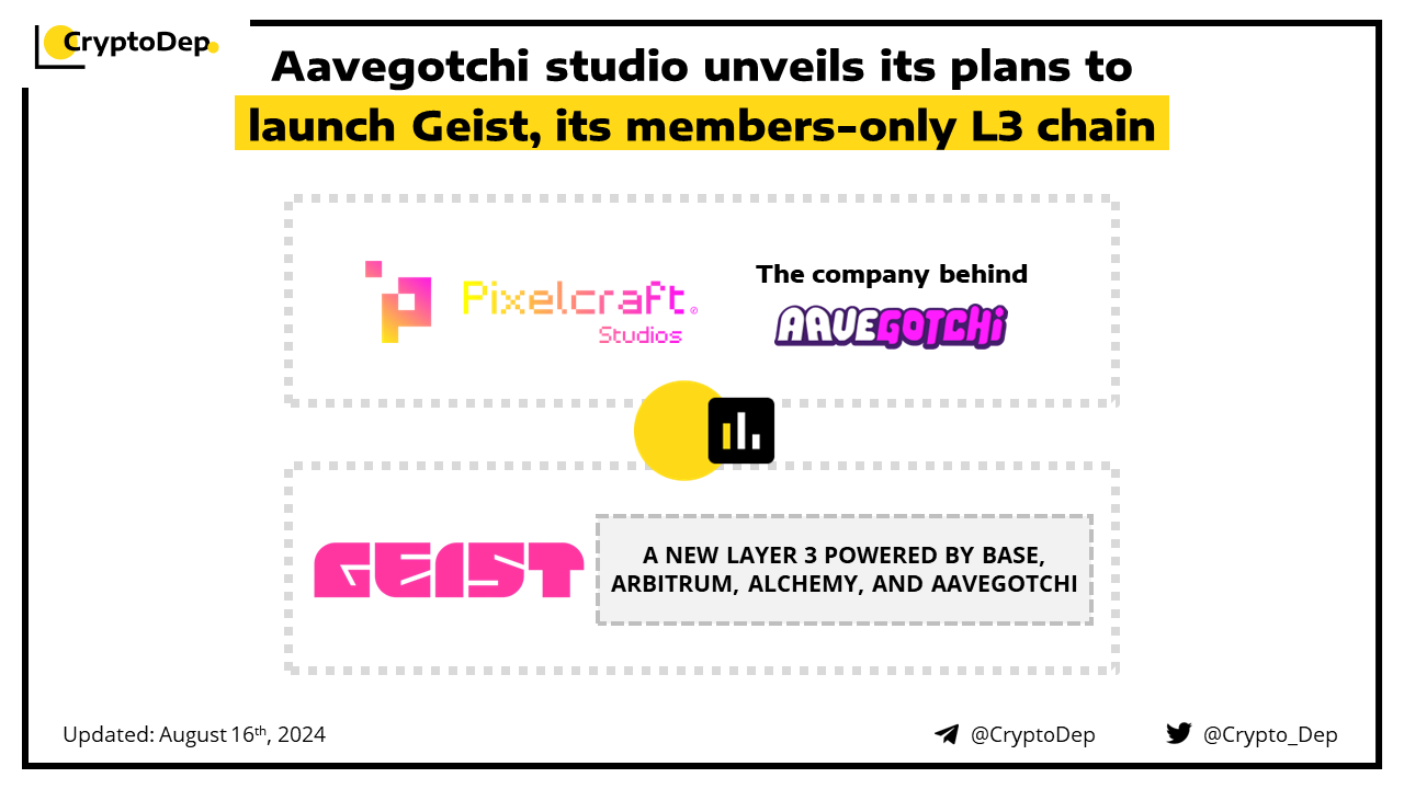 Pixelcraft Studios, the company behind the crypto game Aavegotchi, has announced its plans to launch a members-only Ethereum layer-3 gaming blockchain called Geist. The network will be powered by Base, Arbitrum, Alchemy, and Aavegotchi. Players will be able to gain access to the network through certain criteria, such as owning an Aavegotchi NFT. Moreover, the firm has teased an upcoming Polter Geist testnet. Notably, Geist aims to provide future opportunities for members to earn a portion of marketplace and sequencer fees through staking, per a release.