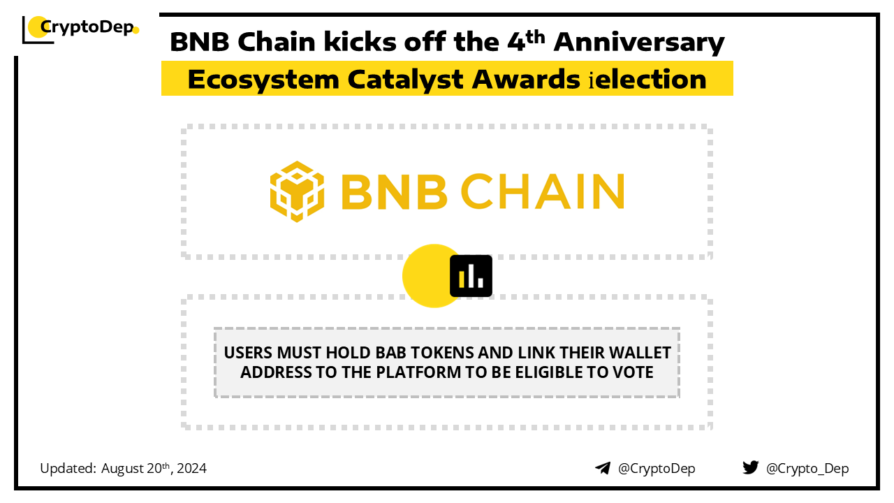 BNB Chain has announced the launch of the 4th Anniversary Ecosystem Catalyst Awards Selection. The selected projects will be split into categories including innovation excellence, DeFi excellence, gaming excellence, infra excellence, and rising star. The BAB token holders will vote through an on-chain voting process while the winners will be announced on September 10th. Moreover, participating community members will also receive exclusive rewards.