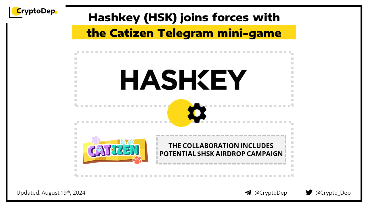 Hashkey Group has announced a partnership with Catizen, a Telegram mini-game, for future collaborations. The collaboration follows Hashkey's bet on the TON ecosystem and includes a potential HSK airdrop campaign. Back in July, Hashkey launched its 10M $HSK community airdrop via a Telegram bot. HashKey Group develops HashKey Chain, a zero knowledge-proof Layer 2 chain.