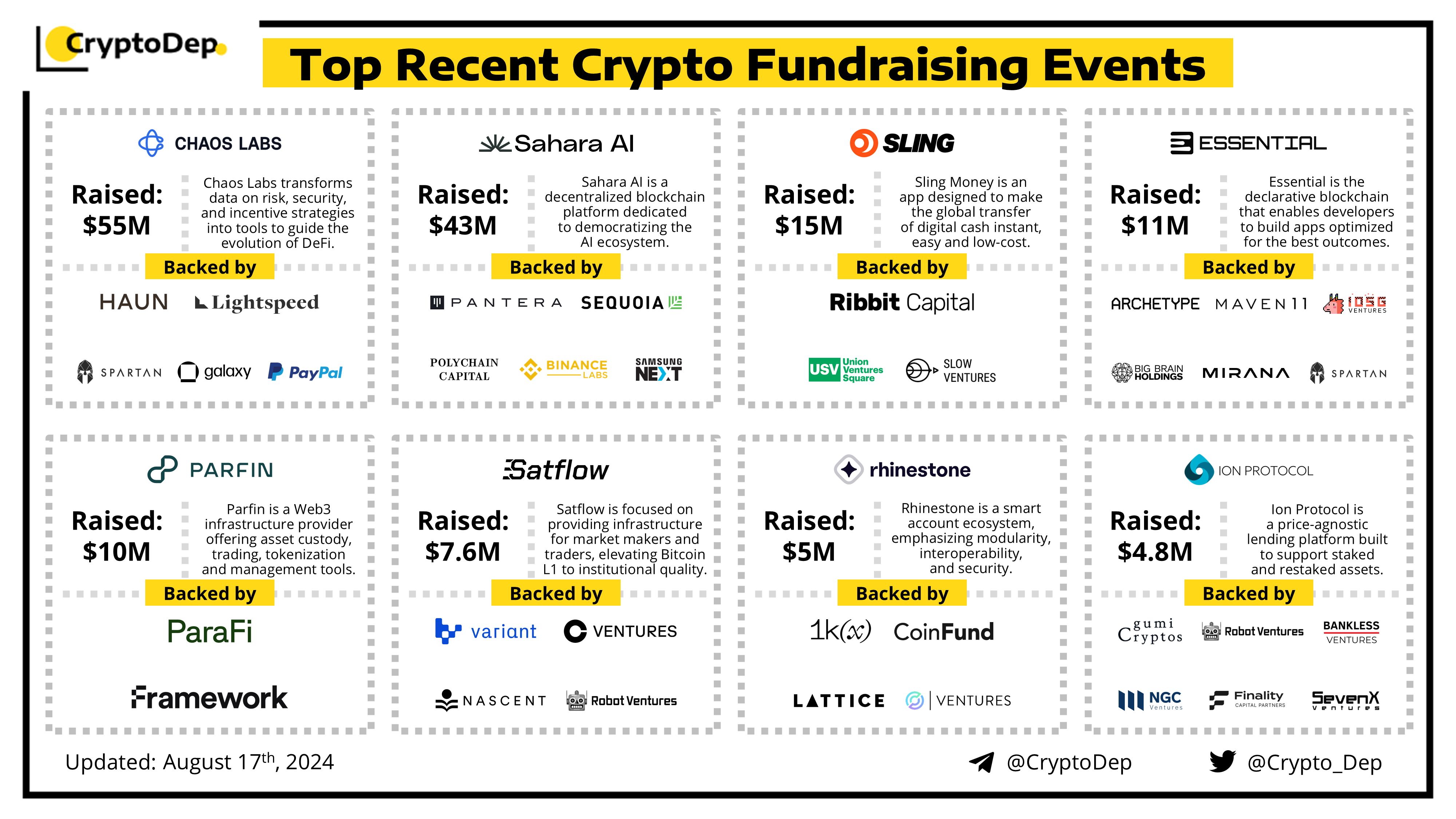 Presenting a list of some recent crypto fundraising events, backed by well-known investors such as Sequoia, Pantera Capital, Binance Labs, Lightspeed, Polychain, CoinFund, Haun Ventures, 1kx, ParaFi, Framework, Variant, IOSG, Spartan, Galaxy, Coinbase Ventures, Circle Ventures, PayPal, and others. Let's take a look!