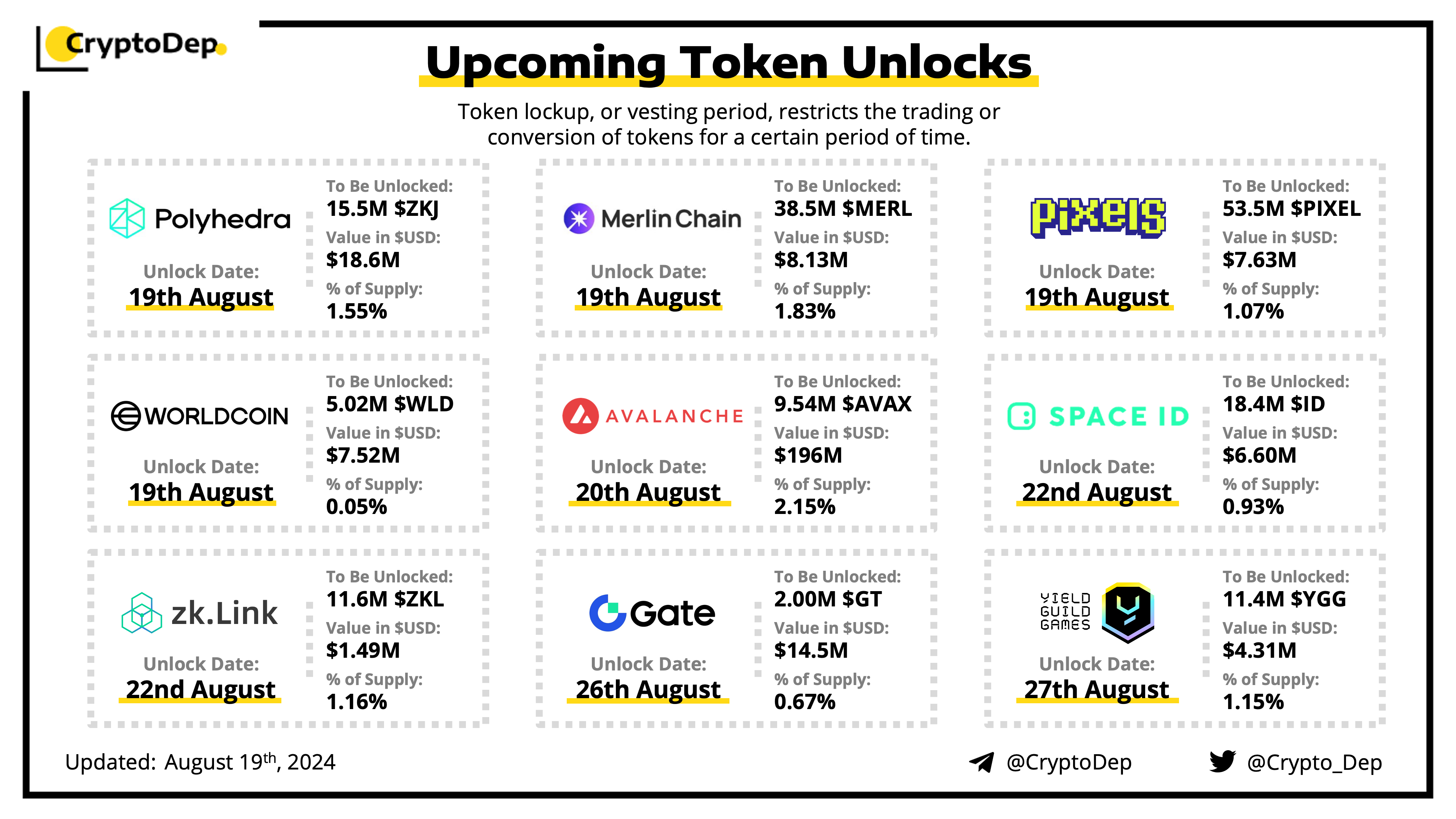 Let's take a look at the compilation of major upcoming token unlocks, diving into details such as dates, amounts, and projects related to tokens that are currently locked up, but will soon be released to the market. During this week, $AVAX, $ZKJ, $GT, $MERL, and $PIXEL will have the biggest unlocks.