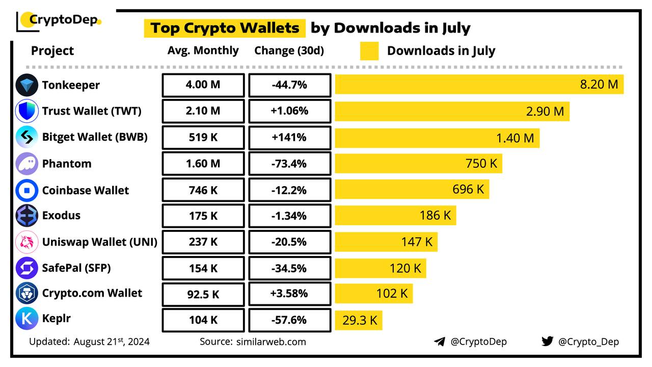 Crypto Wallet is a self-custody wallet, putting you in control of your crypto, keys, and data. Let's take a look at some of the best-performed Crypto Wallet by the number of downloads in July, according to the data from SimilarWeb.