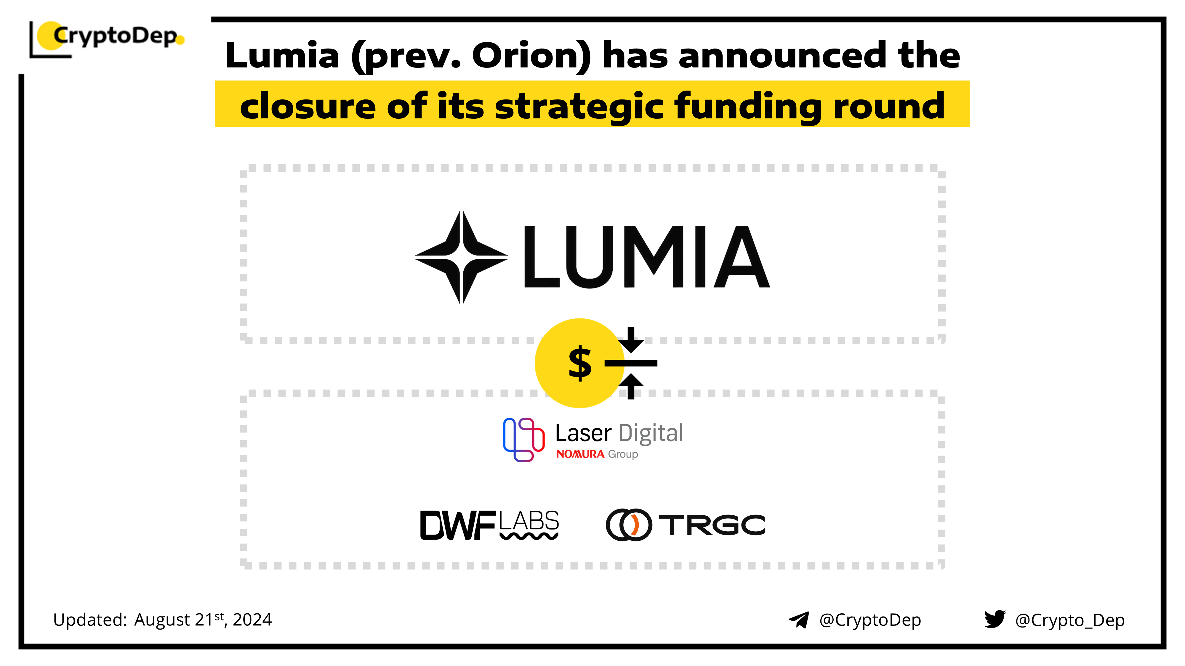 Lumia (prev. Orion) closes its strategic investment round led by Laser Digital, with participation from DWF Labs and TRGC. The round was composed of a mix of future Lumia $LUMIA tokens and nodes from Lumiaβs successful HyperNodes sale, a first-of-its-kind technology that ensures the decentralization and security of the Lumia network upon its launch.