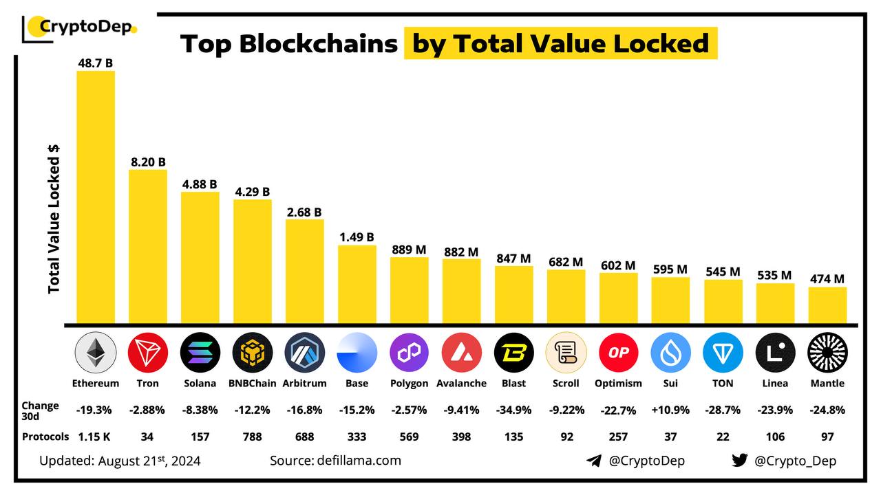 The overall value of crypto assets deposited in blockchain protocols is about $84.4B Ethereum $ETH, Tron $TRX, Solana $SOL, BNB Chain $BNB, and Arbitrum $ARB are among the leaders, according to the data from DeFillama.