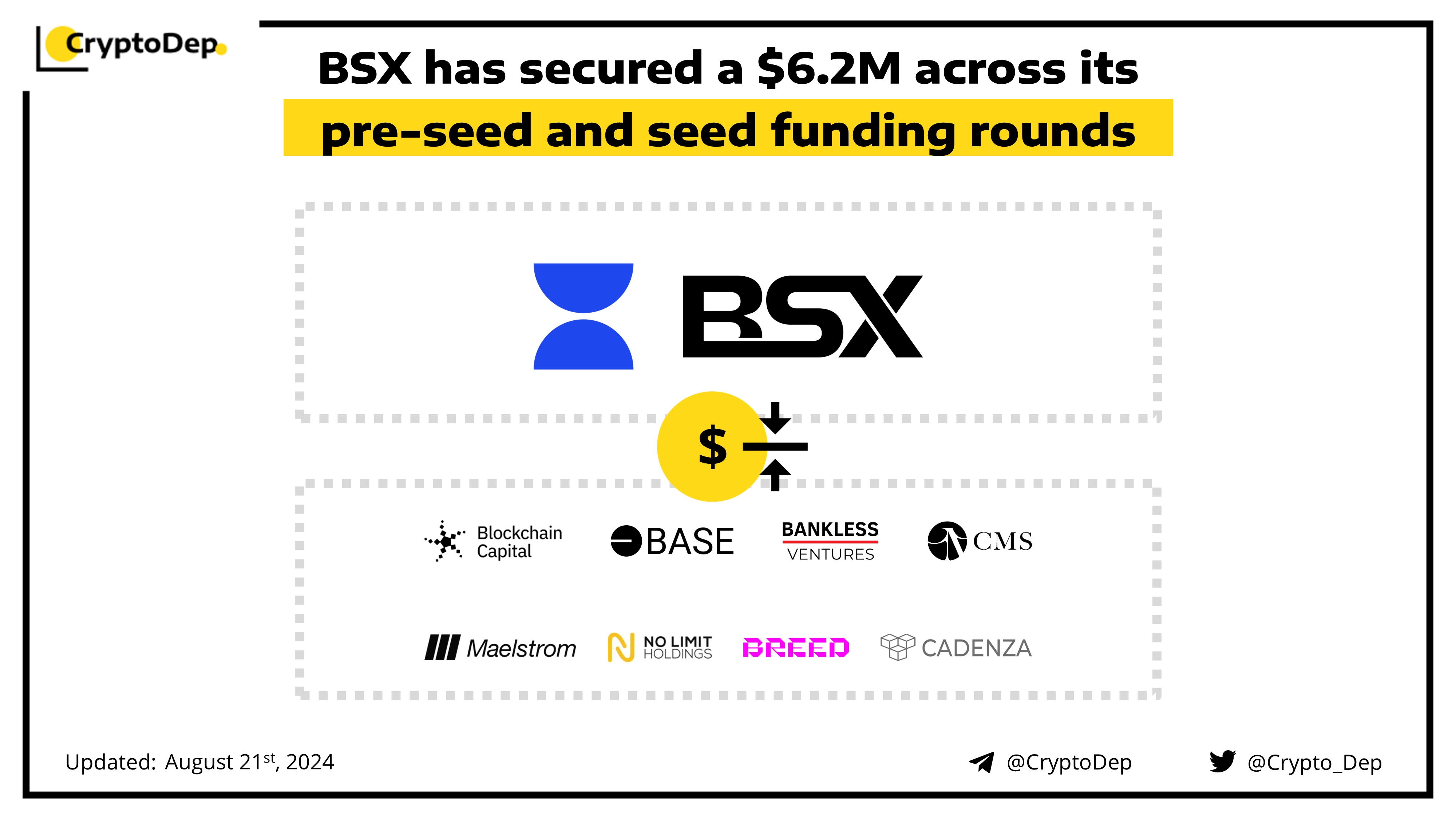 BSX, a self-custodial crypto derivatives decentralized exchange (DEX), built on Base L2 and backed by the Base Ecosystem Fund, raised $6.2M in pre-seed and seed funding rounds. The latest round of $4M was led by Blockchain Capital. Investors across the two rounds include Bankless Ventures, No Limit Holdings, Cadenza Ventures, Breed VC and Arthur Hayes' family office Maelstrom.