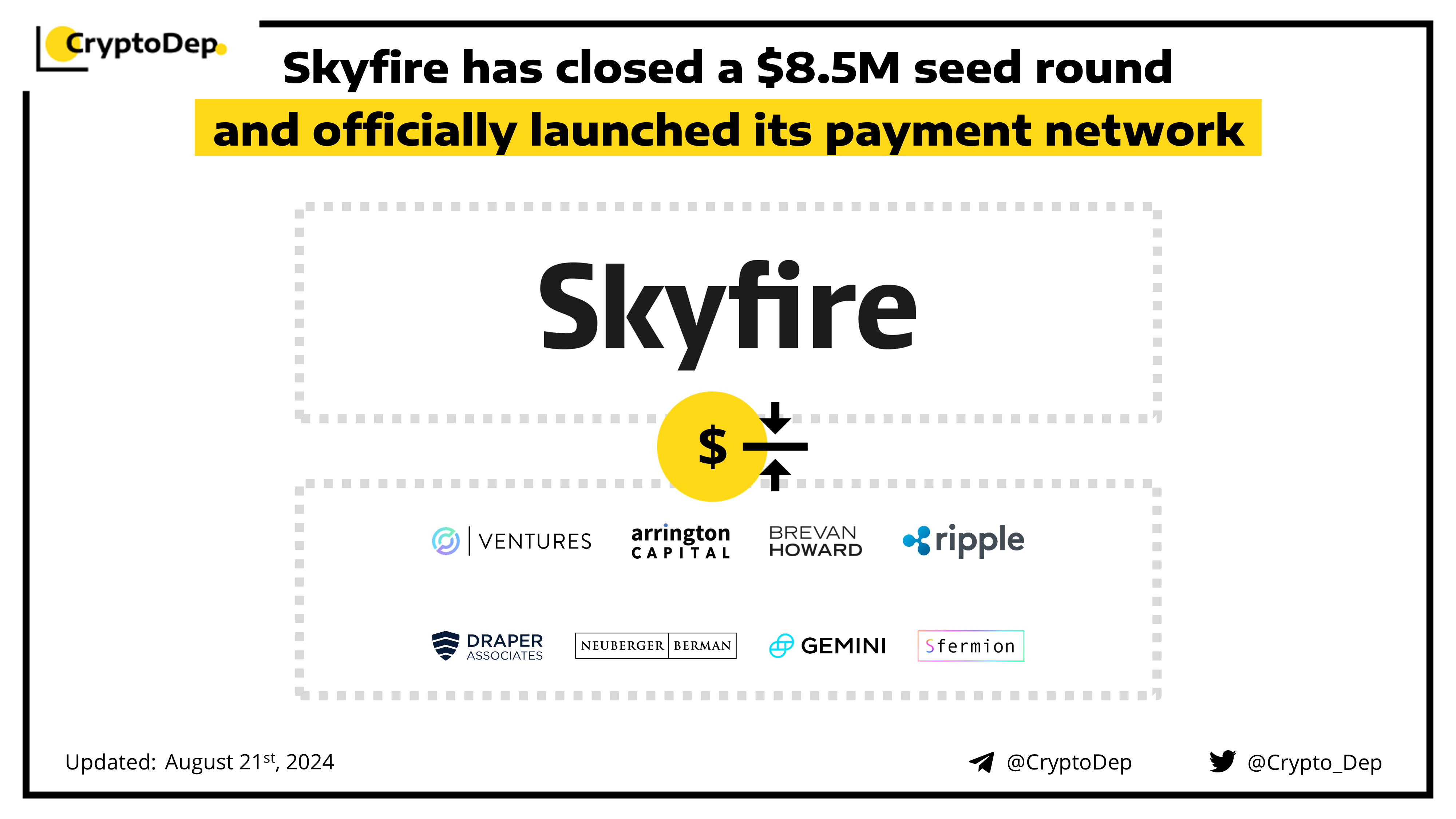 Skyfire has officially launched its payment network to enable fully autonomous transactions across AI Agents. The firm also announced the closure of its $8.5M seed funding round raised from Arrington Capital, Brevan Howard Digital, Sfermion, Circle, Draper Associates, Gemini, Ripple, FBG, ARCA, Neuberger Berman, RedBeard Ventures, and others. Skyfire currently runs on Polygon, but the team plans to expand to additional blockchains soon.