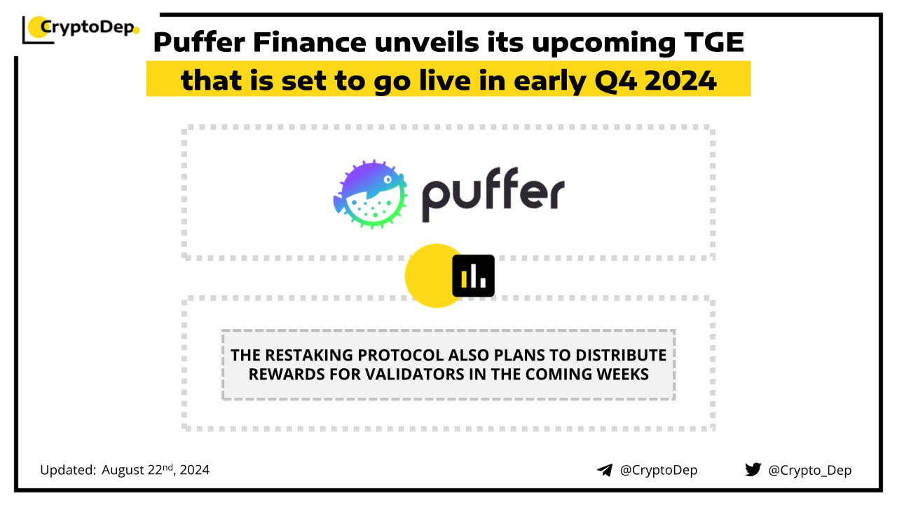Puffer Finance has disclosed its 2024 roadmap that features the project's TGE that will take place in early Q4 2024. Moreover, the project will distribute validator rewards and launch the Puffer UniFi testnet in September. Backed by Binance Labs, Coinbase Ventures, Consensys, and others, Puffer Finance is an Ethereum liquid restaking protocol with $1.34B in total value locked.
