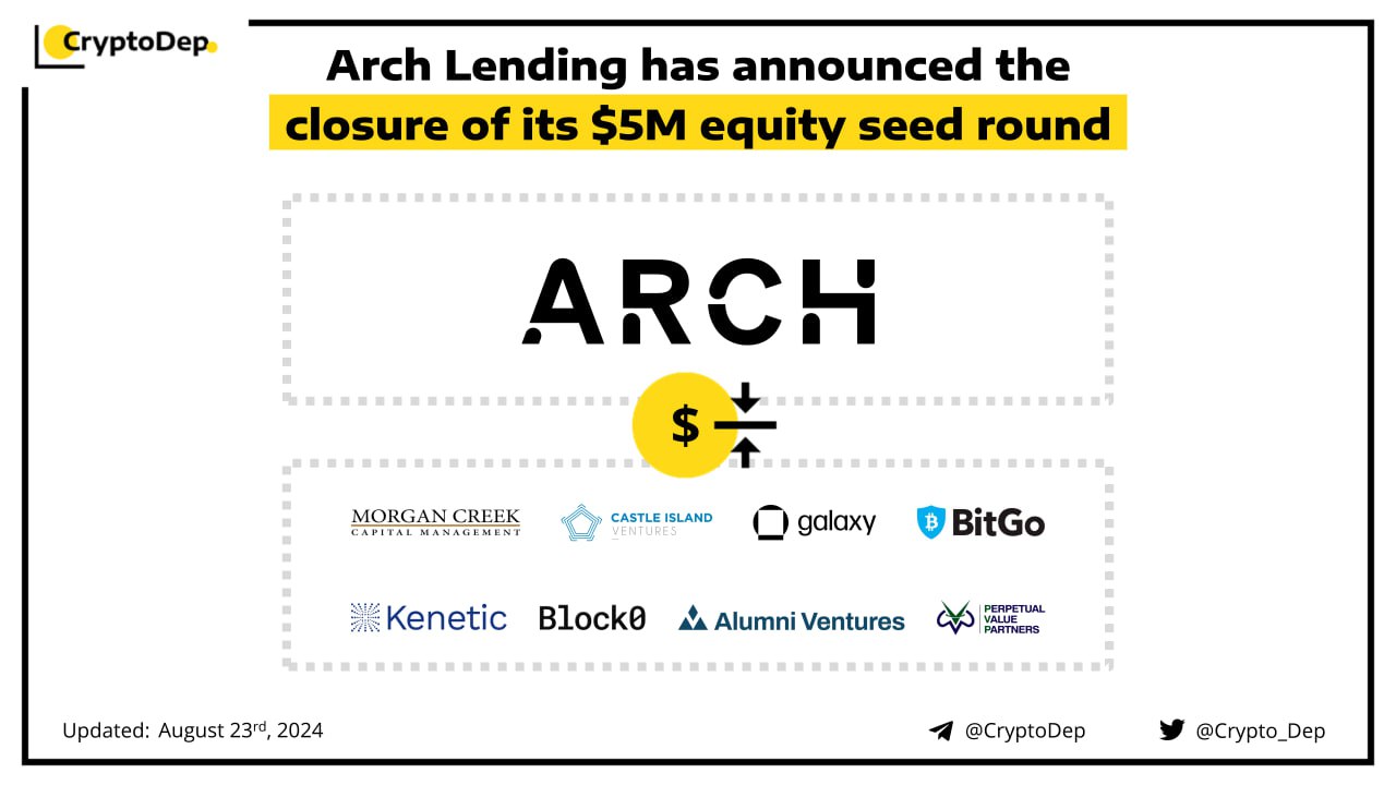 Arch Lending, a financial platform that offers crypto-backed loans, raises $75M in equity and debt. The raise includes a $5M equity seed round, co-led by Morgan Creek Digital & Castle Island Ventures and joined by Galaxy, BitGo, Kenetic, Block0, Untamed Ventures, Alumni Ventures, Perpetual Value Partners, and others. The project has also received a scalable $70M loan financing facility backed by Galaxy.