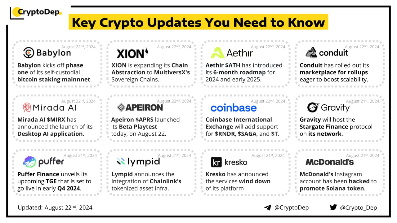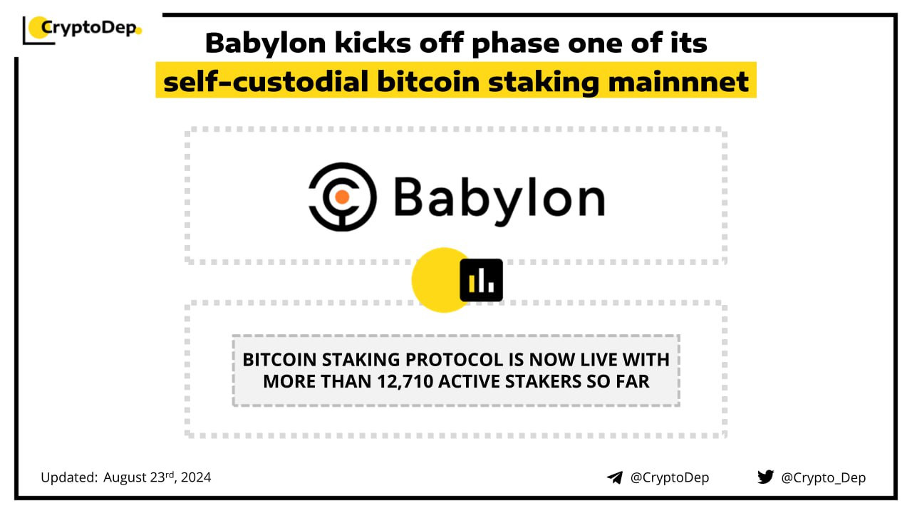 Babylon, a Bitcoin staking protocol, has successfully launched the first phase of its self-custodial mainnet. Users can now stake BTC via smart contracts with 12,710 stakers already onboarded. Among projects that have joined $BTC staking on Babylon are pSTAKE Finance, Bedrock, Solv Protocol, and PumpBTC among others. Babylon is backed by Paradigm, Polychain Capital, OKX Ventures, and Hack VC among others with the total amount raised of $96M.