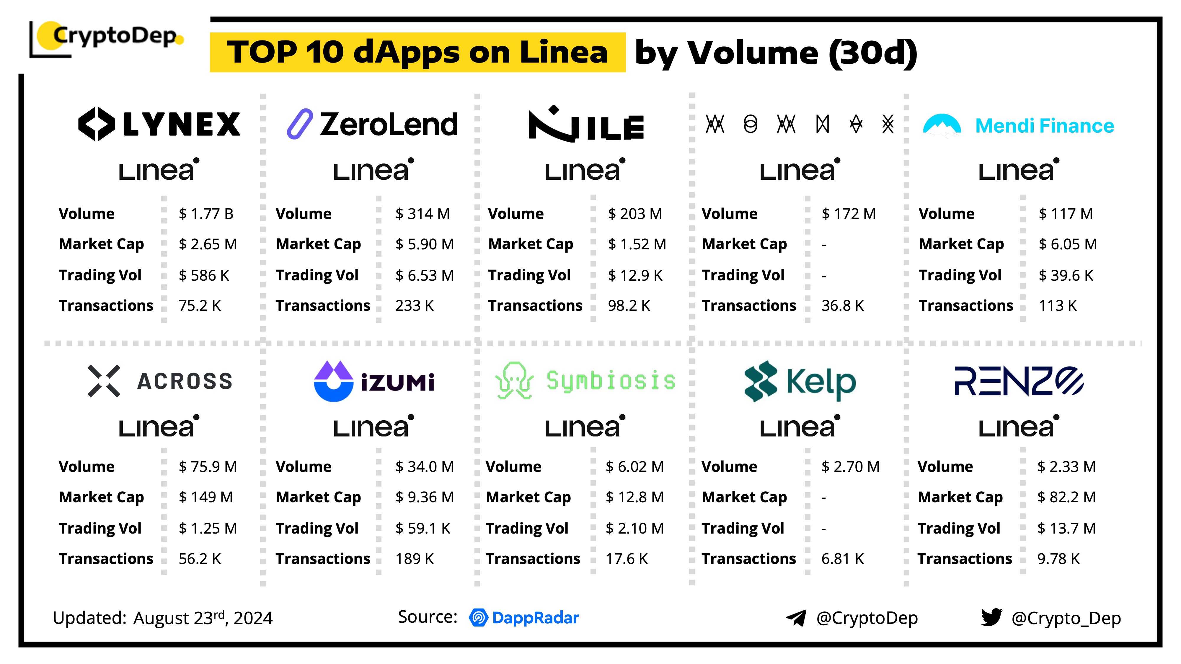 A decentralized application (dApp) is a program built on blockchain that combines a smart contract and a front-end user interface. We present the top dApps on #Linea by volume in the last 30 days, according to the data from DappRadar.