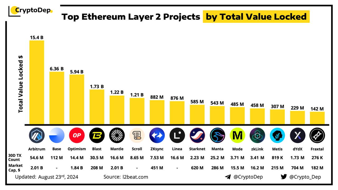 TVL is the overall value of crypto assets deposited in Ethereum Layer 2 networks. The overall TVL among all projects now equals $42.0B with Arbitrum $ARB, Base, Optimism $OP, Blast $BLAST, and Mantle $MNT making the top leaders.