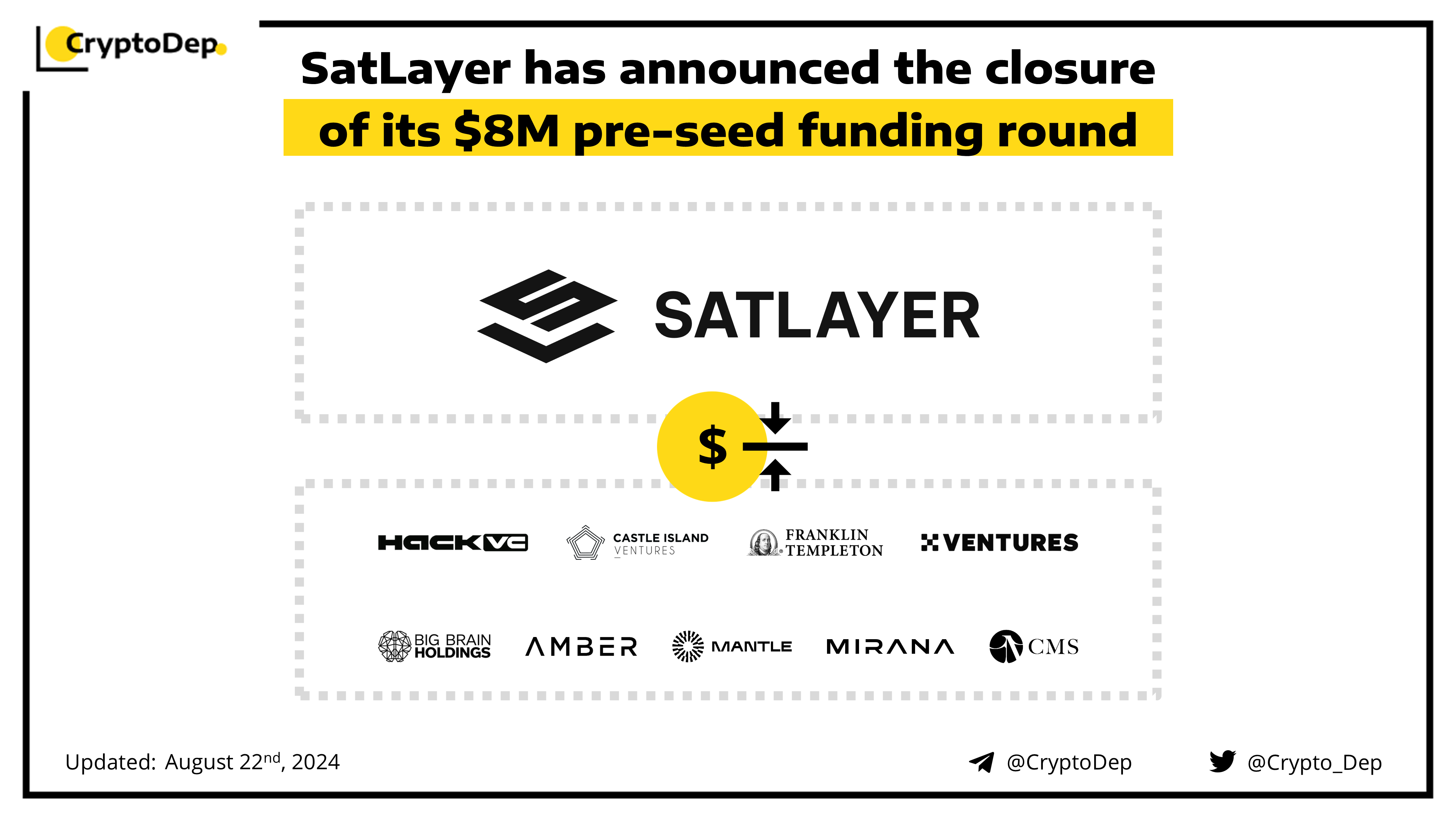 SatLayer has raised $8M in a pre-seed round co-led by Hack VC and Castle Island Ventures, with Franklin Templeton, OKX Ventures, Mirana Ventures, Amber Group, Big Brain Holdings, CMS Holdings, Mantle EcoFund, Arcanum, Finality Capital, and others participating. SatLayer is a #Bitcoin restaking platform built on the Bitcoin $BTC staking protocol Babylon.