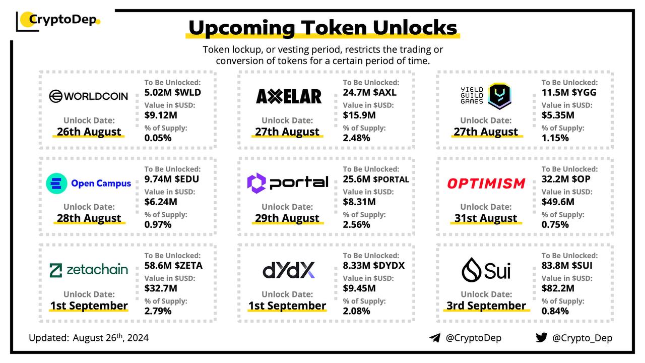 Let's take a look at the compilation of major upcoming token unlocks, diving into details such as dates, amounts, and projects related to tokens that are currently locked up, but will soon be released to the market. During this week, $SUI, $OP, $ZETA, $AXL, and $DYDX will have the biggest unlocks.