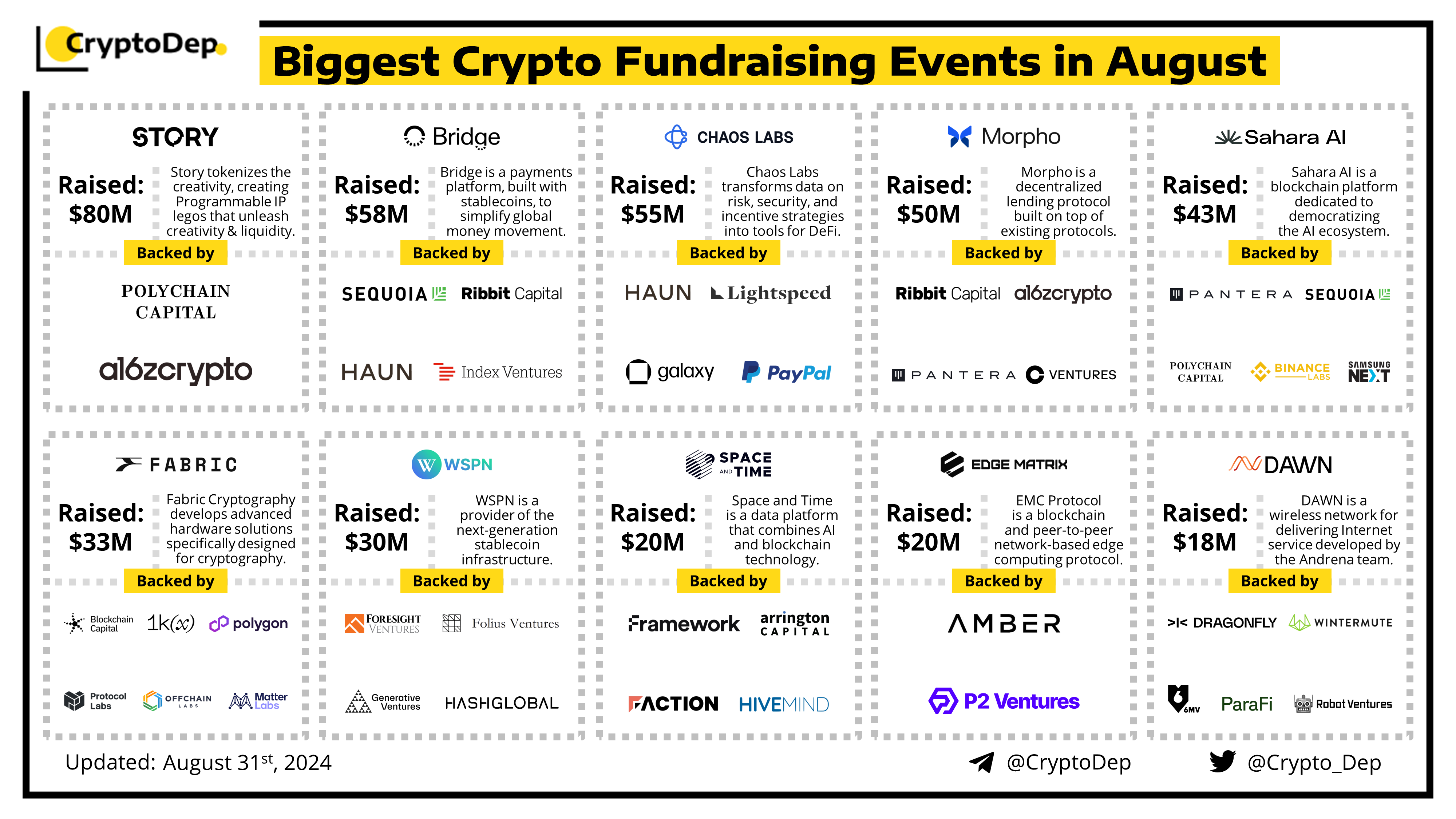 Presenting a list of the biggest crypto fundraising rounds in August 2024, backed by well-known investors such as a16z crypto, Sequoia, Dragonfly, Pantera Capital, Galaxy, Haun, PayPal, Coinbase Ventures, ParaFi, Binance Labs, Lightspeed, Polychain, Arrington Capital, Polygon, and others. Let's take a look!