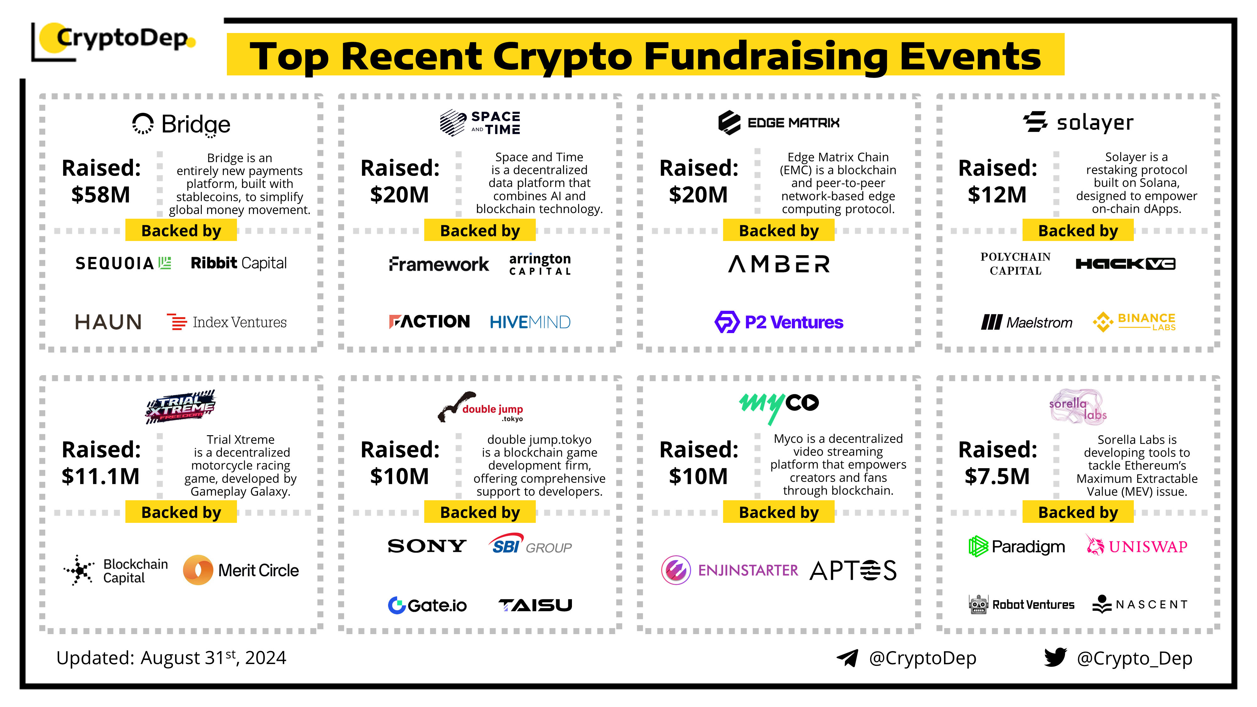 Presenting a list of some recent crypto fundraising events, backed by well-known investors such as Sequoia Capital, Paradigm, Polychain, Blockchain Capital, Hack VC, Polygon Ventures, Haun, Sony, Framework, Arrington Capital, Maelstrom, Binance Labs, Uniswap, Merit Circle, and others. Let's take a look!