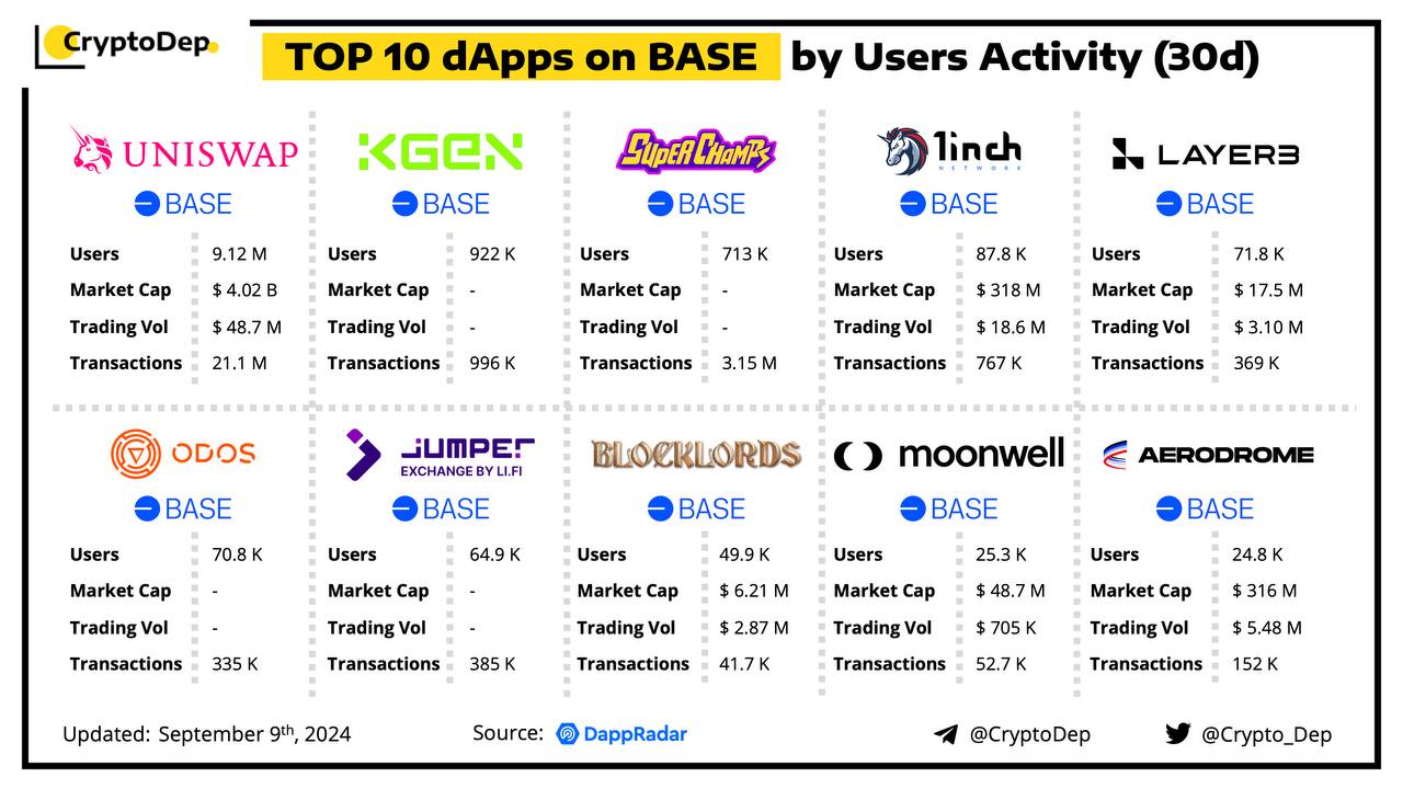 A decentralized application (dApp) is a program built on blockchain that combines a smart contract and a front-end user interface. We present the top dApps on #Base by users activity in the last 30 days, according to the data from DappRadar.