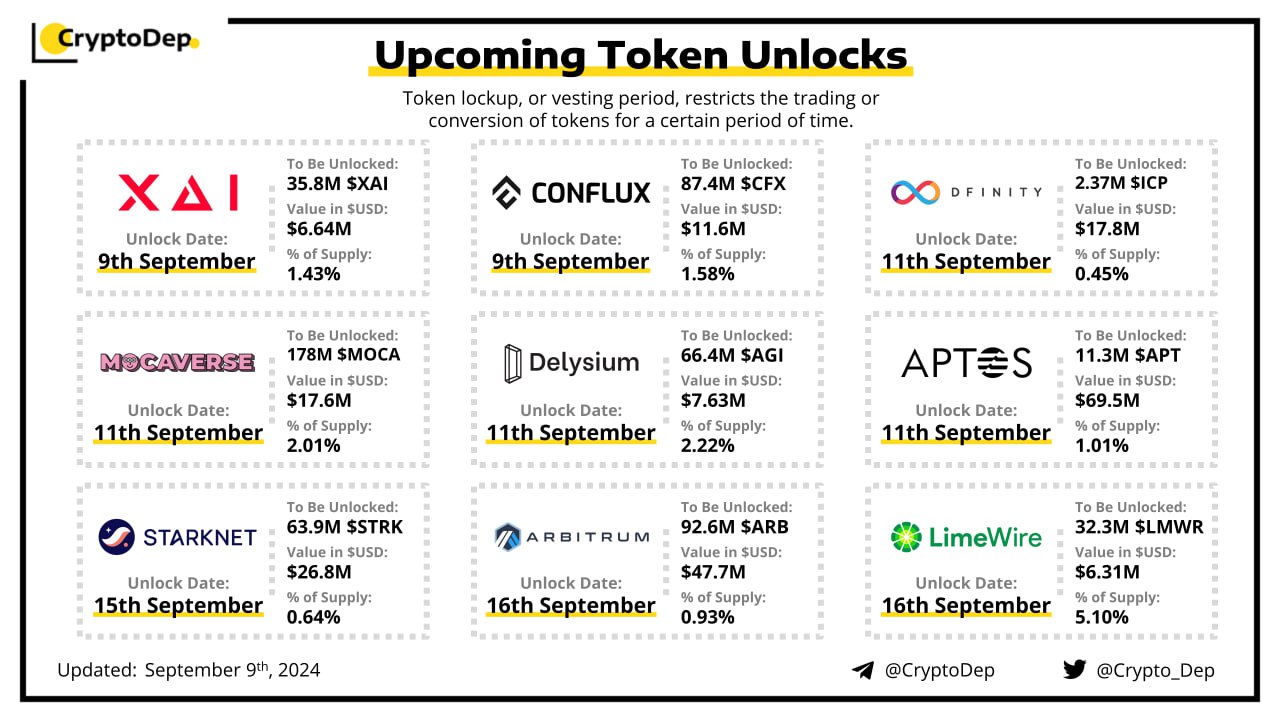 Let's take a look at the compilation of major upcoming token unlocks, diving into details such as dates, amounts, and projects related to tokens that are currently locked up, but will soon be released to the market. During this week, $APT, $ARB, $STRK, $ICP, and $MOCA will have the biggest unlocks.