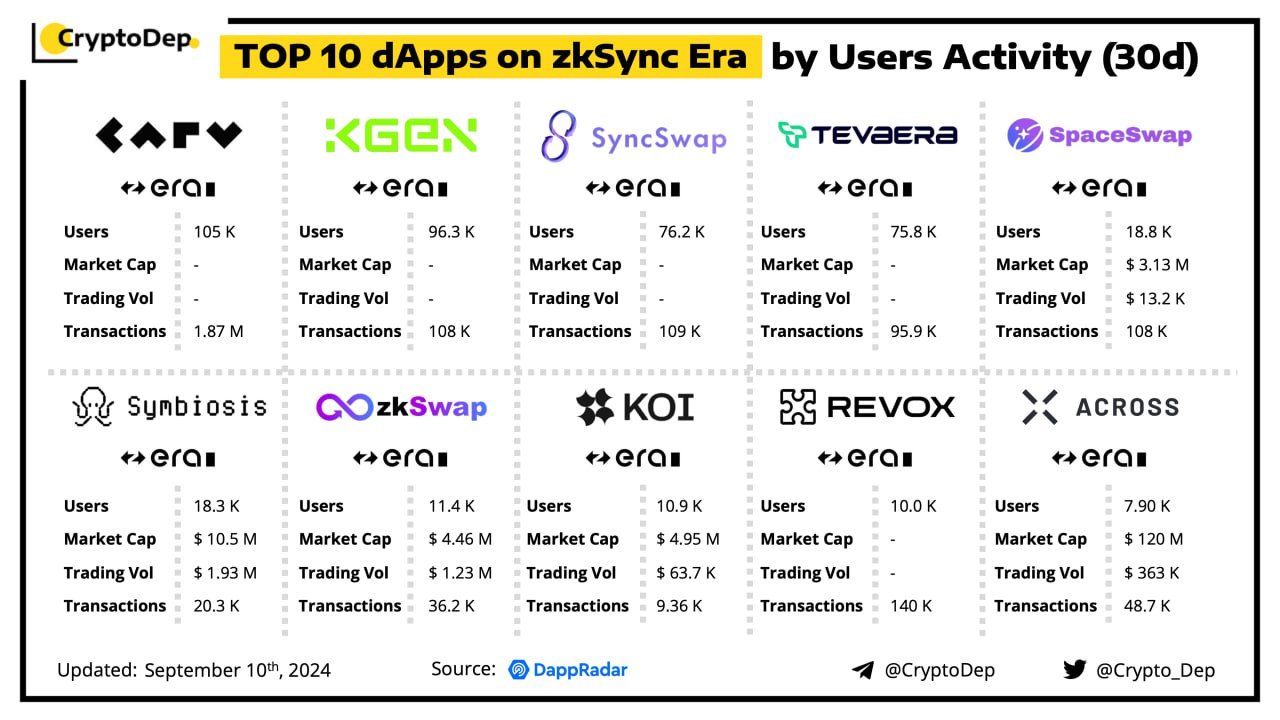 ββTop 10 dApps on zkSync Era by Users Activity (30d)